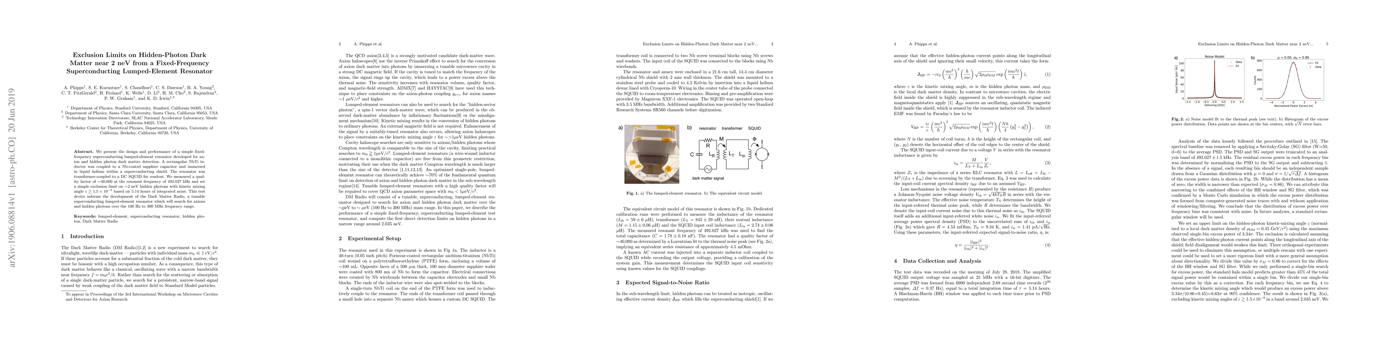 This paper details a fixed-frequency superconducting resonator designed for detecting axion and hidden photon dark matter, achieving a high quality factor of 40,000. It sets an exclusion limit on 2 neV hidden photons with a kinetic mixing angle greater than $1.5\times10^{-9}$.