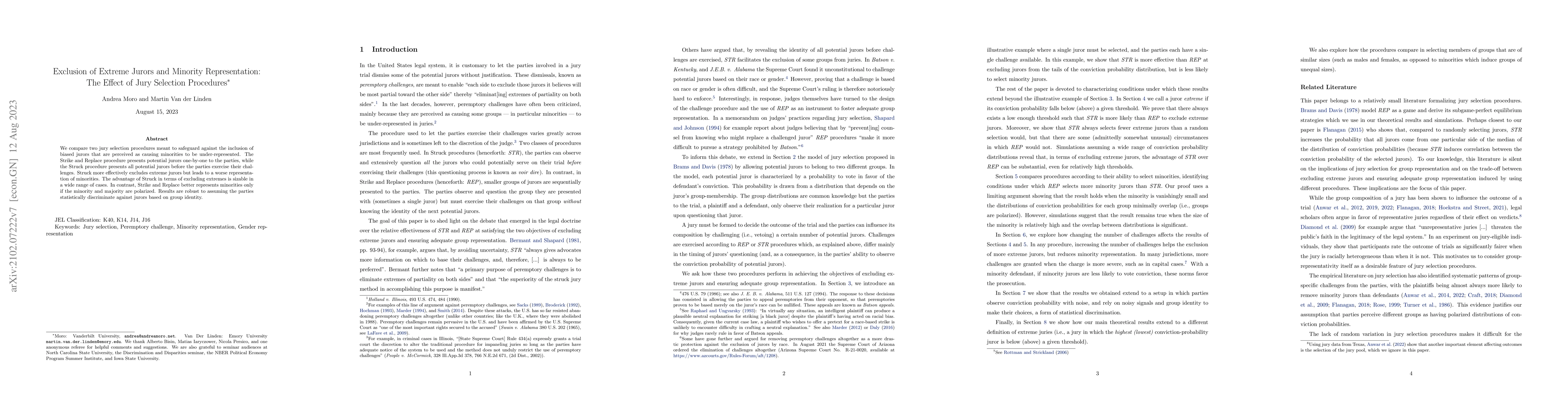 This study compares two jury selection procedures—Strike and Replace and Struck—to determine their impact on excluding biased jurors and minority representation. Struck is more effective at excluding extreme jurors but results in poorer minority representation, while Strike and Replace better represents minorities, especially when groups are polarized.