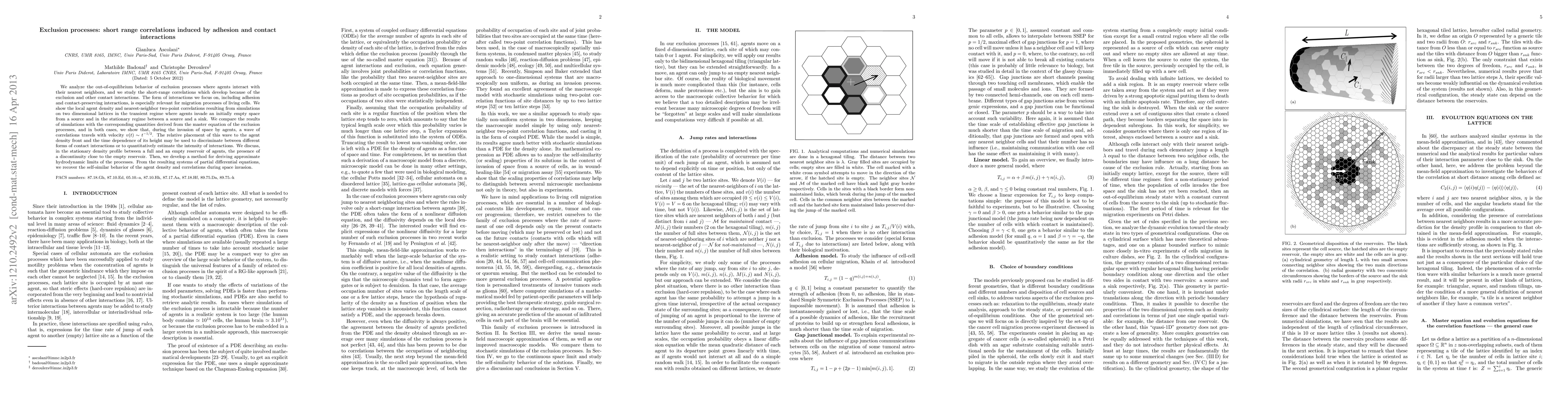 We analyze the out-of-equilibrium behavior of exclusion processes where agents interact with their nearest neighbors, and we study the short-range correlations which develop because of the exclusion and other contact interactions. The form of interactions we focus on, including adhesion and contact-preserving interactions, is especially relevant for migration processes of living cells. We show the local agent density and nearest-neighbor two-point correlations resulting from simulations on two dimensional lattices in the transient regime where agents invade an initially empty space from a source and in the stationary regime between a source and a sink. We compare the results of simulations with the corresponding quantities derived from the master equation of the exclusion processes, and in both cases, we show that, during the invasion of space by agents, a wave of correlations travels with velocity v(t) ~ t^(-1/2). The relative placement of this wave to the agent density front and the time dependence of its height may be used to discriminate between different forms of contact interactions or to quantitatively estimate the intensity of interactions. We discuss, in the stationary density profile between a full and an empty reservoir of agents, the presence of a discontinuity close to the empty reservoir. Then, we develop a method for deriving approximate hydrodynamic limits of the processes. From the resulting systems of partial differential equations, we recover the self-similar behavior of the agent density and correlations during space invasion.