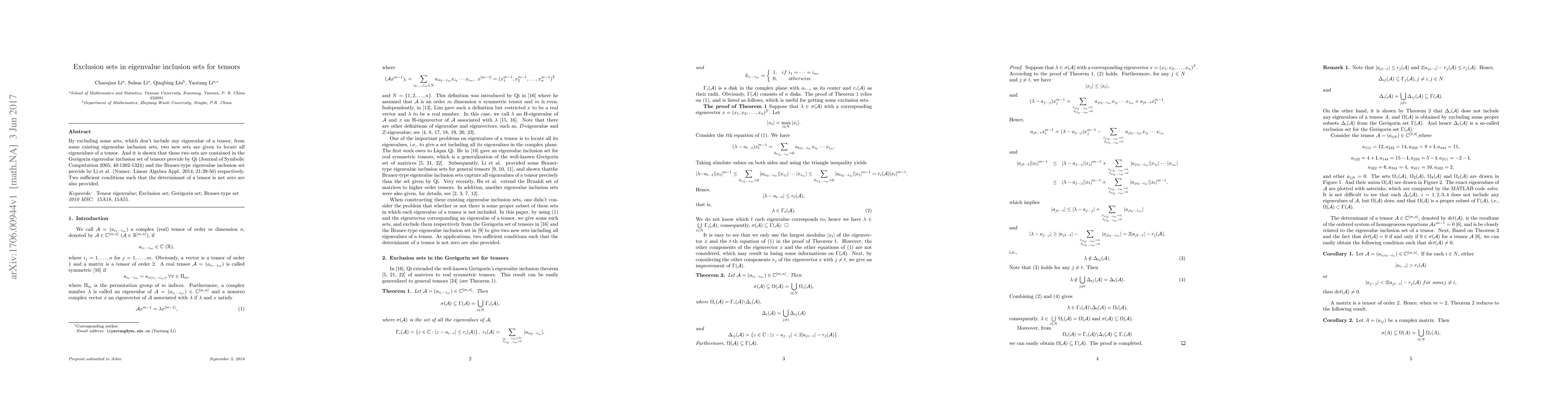 By excluding some sets, which don't include any eigenvalue of a tensor, from some existing eigenvalue inclusion sets, two new sets are given to locate all eigenvalues of a tensor. And it is shown that these two sets are contained in the Ger\v{s}gorin eigenvalue inclusion set of tensors provide by Qi (Journal of Symbolic Computation 2005; 40:1302-1324) and the Brauer-type eigenvalue inclusion set provide by Li et al. (Numer. Linear Algebra Appl. 2014; 21:39-50) respectively. Two sufficient conditions such that the determinant of a tensor is not zero are also provided.