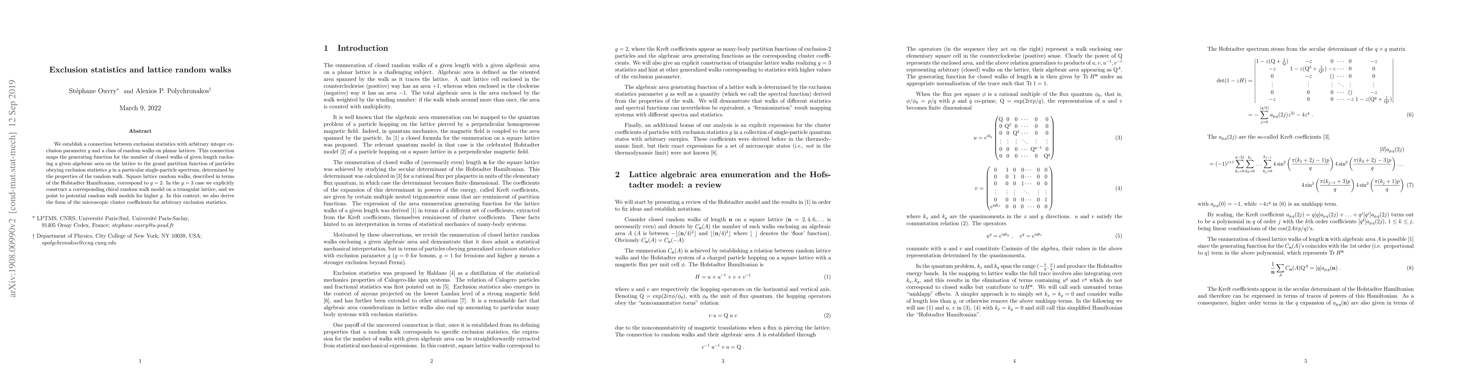 We establish a connection between exclusion statistics with arbitrary integer exclusion parameter $g$ and a class of random walks on planar lattices. This connection maps the generating function for the number of closed walks of given length enclosing a given algebraic area on the lattice to the grand partition function of particles obeying exclusion statistics $g$ in a particular single-particle spectrum, determined by the properties of the random walk. Square lattice random walks, described in terms of the Hofstadter Hamiltonian, correspond to $g=2$. In the $g=3$ case we explicitly construct a corresponding chiral random walk model on a triangular lattice, and we point to potential random walk models for higher $g$. In this context, we also derive the form of the microscopic cluster coefficients for arbitrary exclusion statistics.