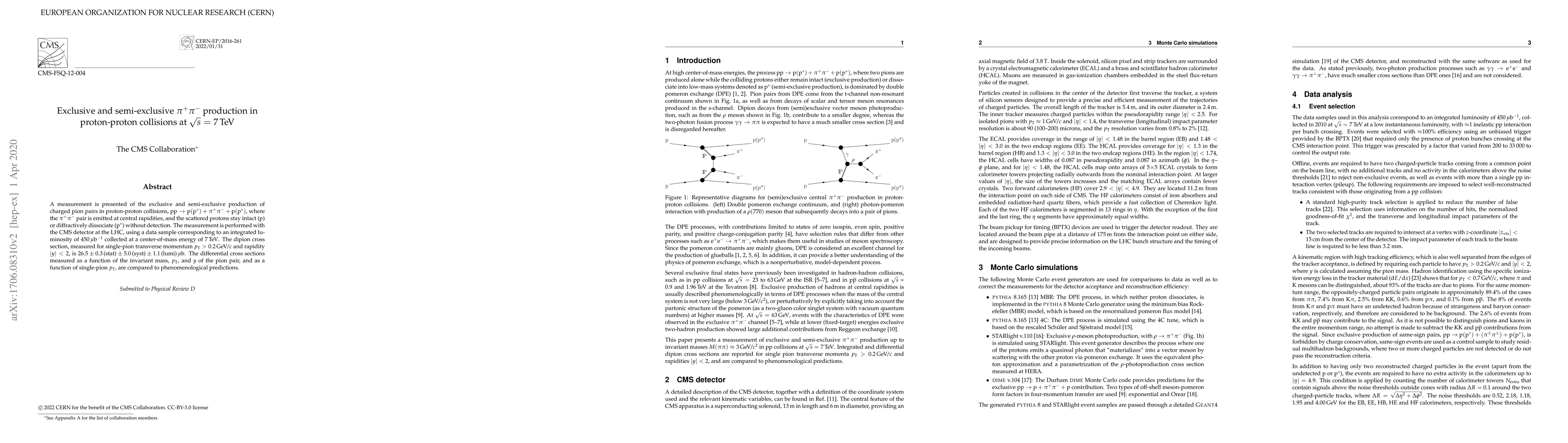 This paper reports on the exclusive and semi-exclusive production of $\pi^+\pi^-$ pairs in proton-proton collisions at 7 TeV, measured using the CMS detector at the LHC. The study finds a dipion cross-section of 26.5 +/- 0.3 microbarns and compares differential cross sections to phenomenological predictions.