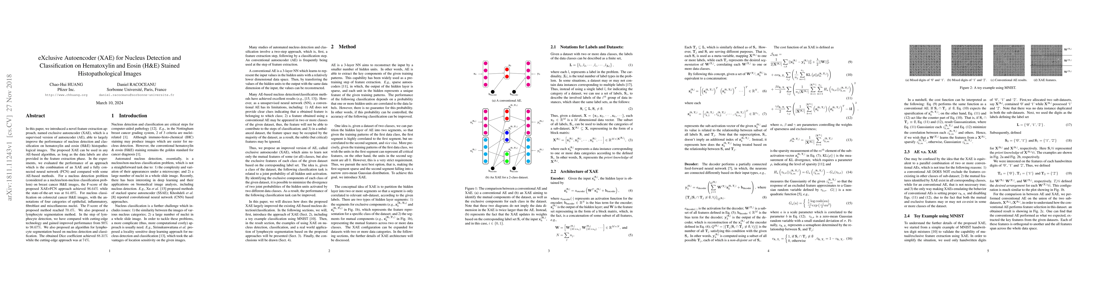 This paper introduces the exclusive autoencoder (XAE), a supervised autoencoder for enhanced feature extraction in nucleus detection and classification on H&E stained histopathological images. The XAE+FCN approach achieved superior F-scores for breast cancer and colorectal cancer nucleus detection and classification, outperforming state-of-the-art methods.