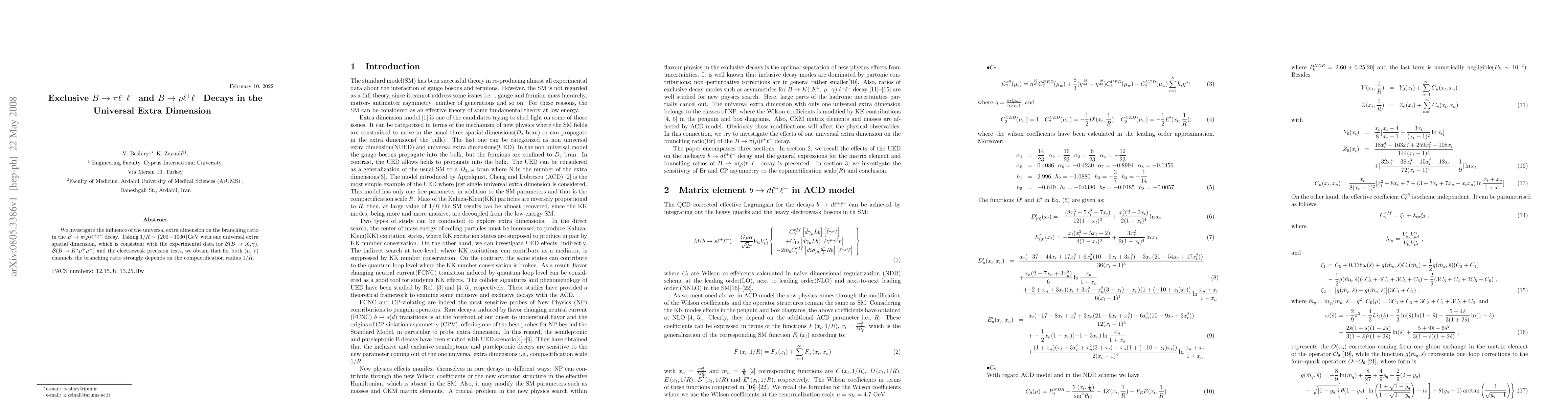 This paper examines the impact of a universal extra dimension on the branching ratios of $B \to \pi \ell^+ \ell^-$ and $B \to \rho \ell^+ \ell^-$ decays, finding that the branching ratios are strongly dependent on the compactification radius 1/R, consistent with existing experimental data.