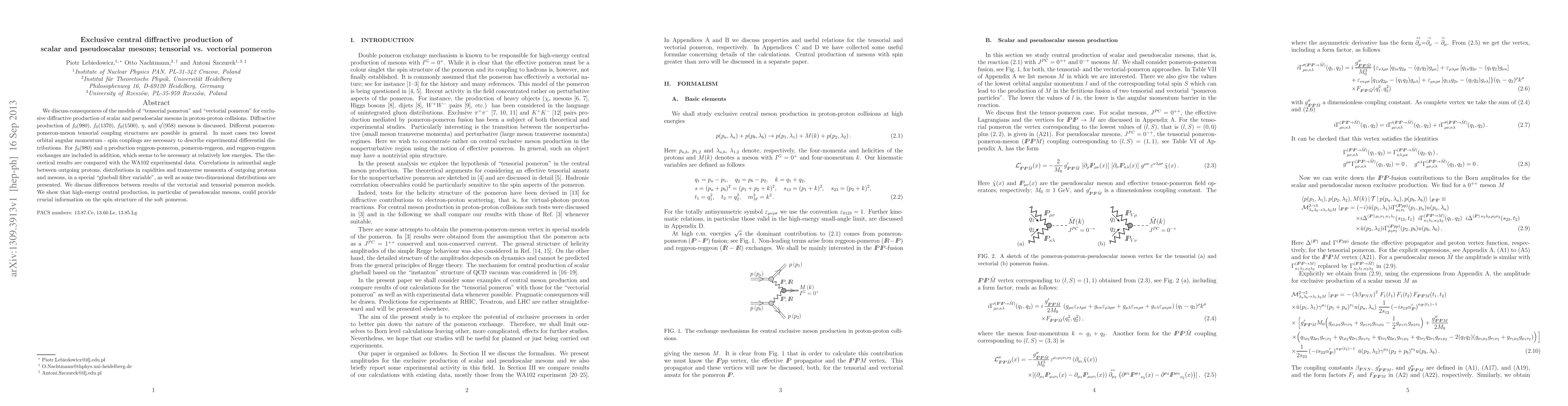 This paper explores the exclusive central diffractive production of scalar and pseudoscalar mesons in proton-proton collisions, comparing the tensorial and vectorial pomeron models. It highlights the necessity of low orbital angular momentum couplings and includes reggeon-pomeron exchanges for certain mesons, and discusses implications for the spin structure of the soft pomeron.