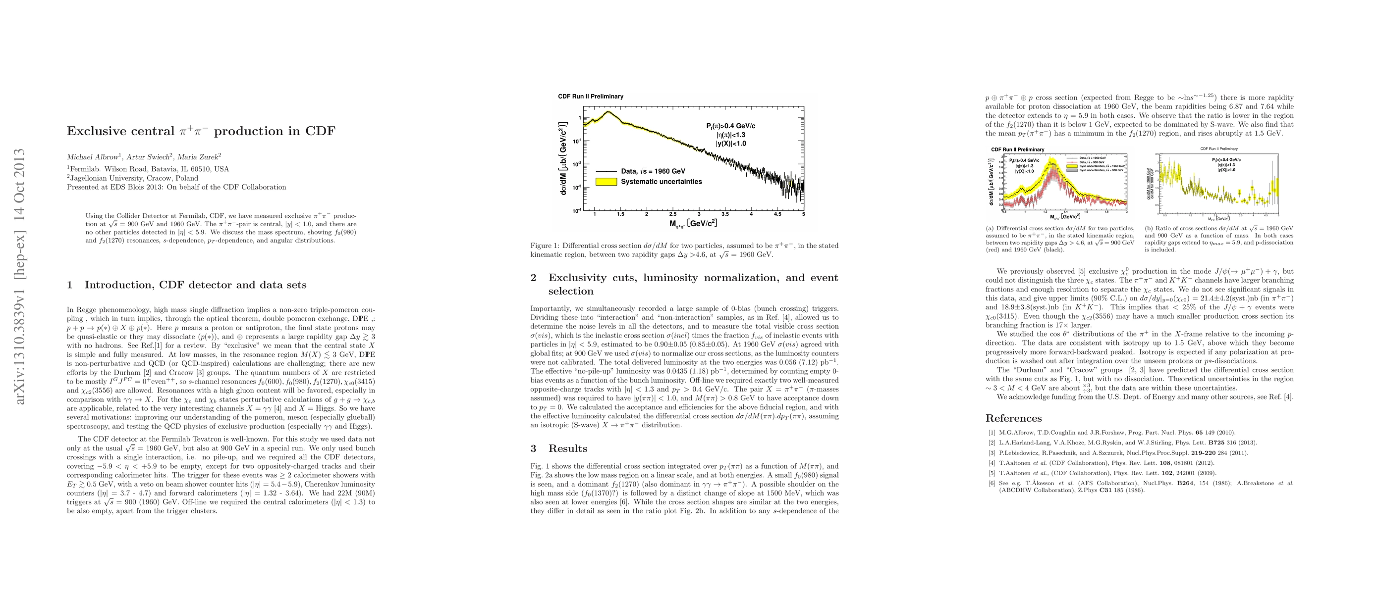 The CDF experiment at Fermilab measured exclusive central pi+pi- production at 900 GeV and 1960 GeV, identifying f0(980) and f2(1270) resonances, and analyzing mass spectrum, pT-dependence, and angular distributions. The results provide insights into the dynamics of central meson pair production.
