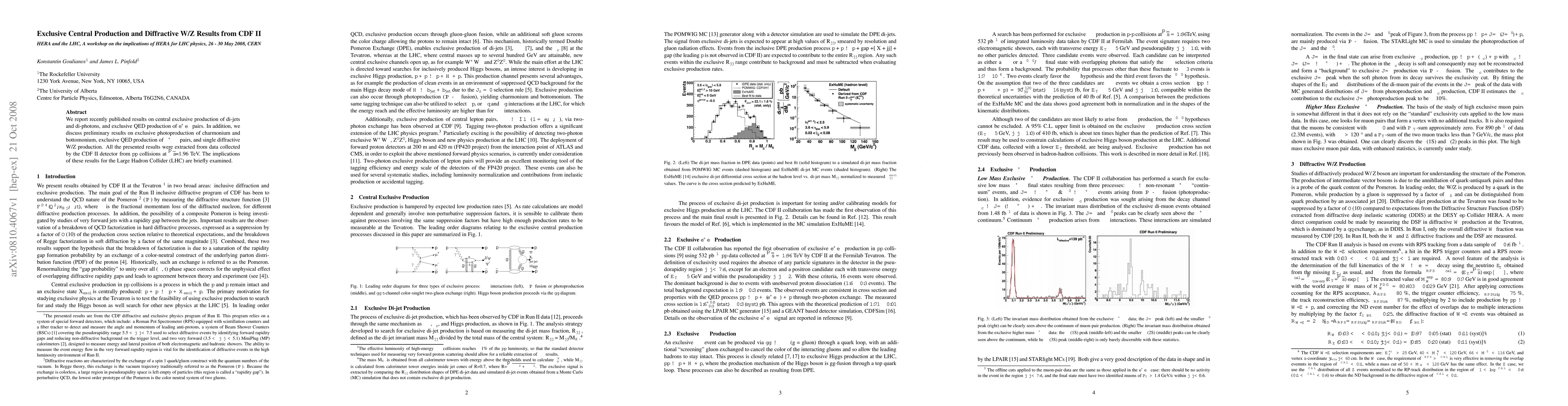 This paper presents results from CDF II on central exclusive production of di-jets, di-photons, and e+e- pairs, alongside preliminary findings on charmonium and bottomonium photoproduction, mu+mu- pairs, and single diffractive W/Z production from proton-antiproton collisions at 1.96 TeV. Implications for the Large Hadron Collider are briefly discussed.