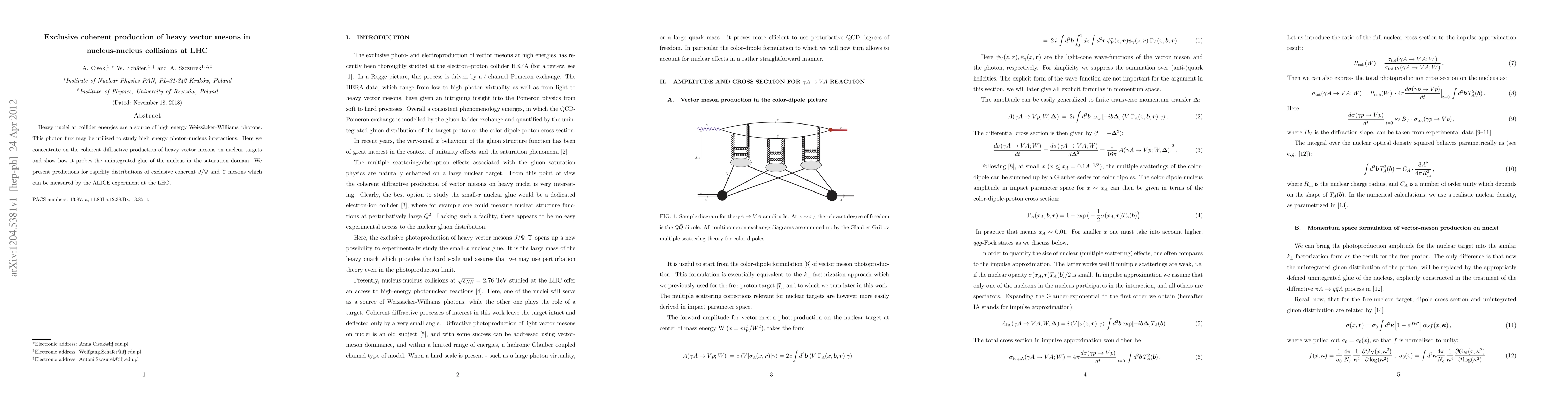 Heavy nuclei at collider energies are a source of high energy Weizsaecker-Williams photons. This photon flux may be utilized to study high energy photon-nucleus interactions. Here we concentrate on the coherent diffractive production of heavy vector mesons on nuclear targets and show how it probes the unintegrated glue of the nucleus in the saturation domain. We present predictions for rapidity distributions of exclusive coherent J/Psi and Upsilon mesons which can be measured by the ALICE experiment at the LHC.