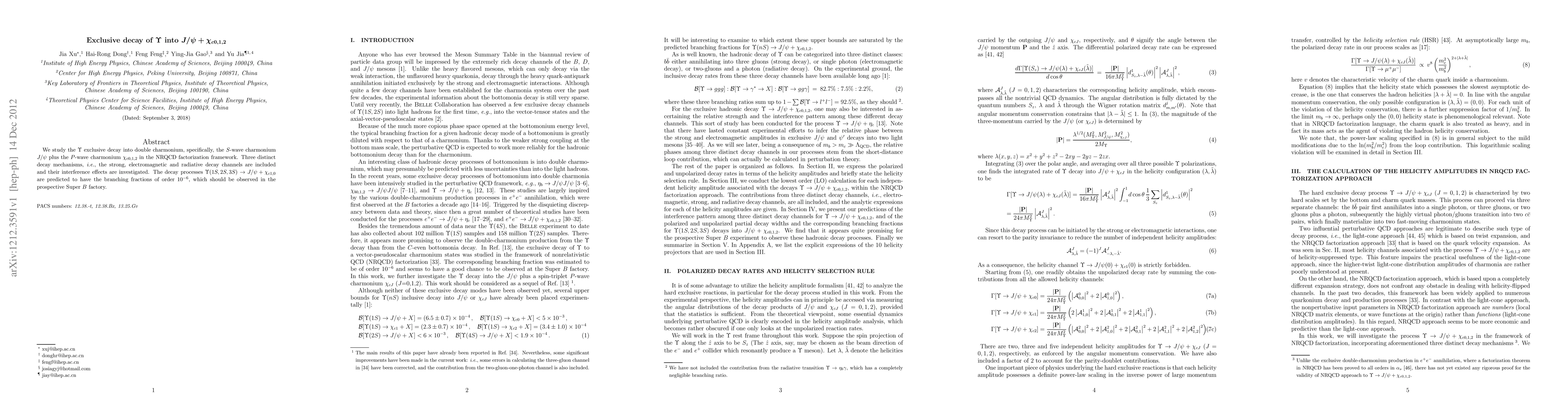 We study the $\Upsilon$ exclusive decay into double charmonium, specifically, the $S$-wave charmonium $ J/\psi$ plus the $P$-wave charmonium $\chi_{c0,1,2}$ in the NRQCD factorization framework. Three distinct decay mechanisms, i.e., the strong, electromagnetic and radiative decay channels are included and their interference effects are investigated. The decay processes $\Upsilon(1S,2S,3S)\to J/\psi+\chi_{c1,0}$ are predicted to have the branching fractions of order $10^{-6}$, which should be observed in the prospective Super $B$ factory.