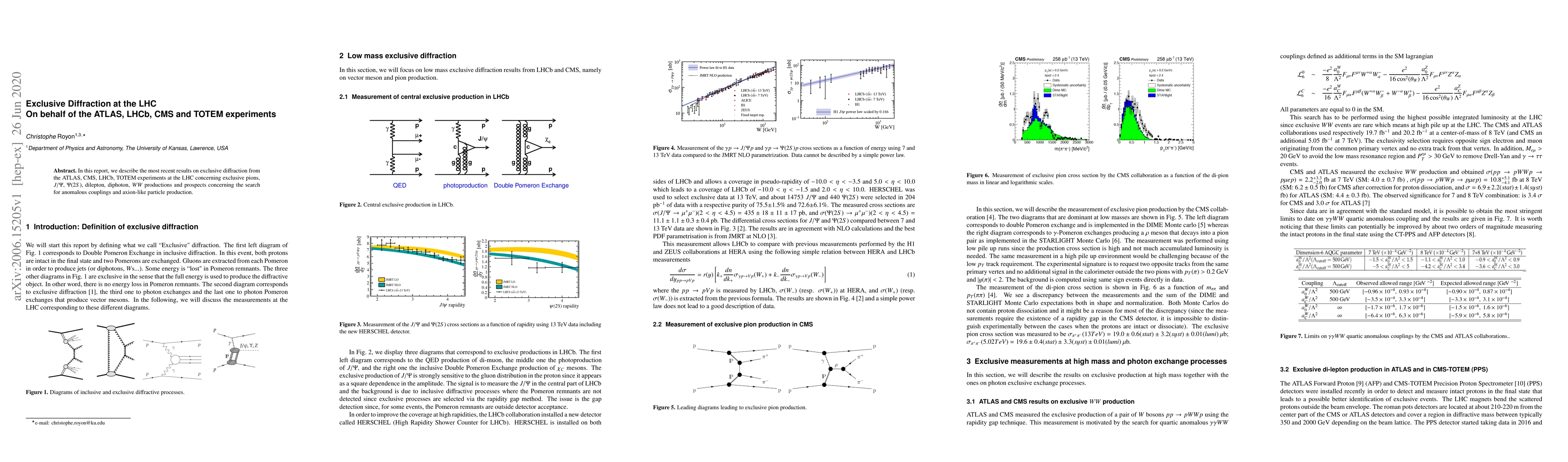 In this report, we describe the most recent results on exclusive diffraction from the ATLAS, CMS, LHCb, TOTEM experiments at the LHC concerning exclusive pions, $J/\Psi$, $\Psi(2S)$, dilepton, diphoton, $WW$ productions and prospects concerning the search for anomalous couplings and axion-like particle production.