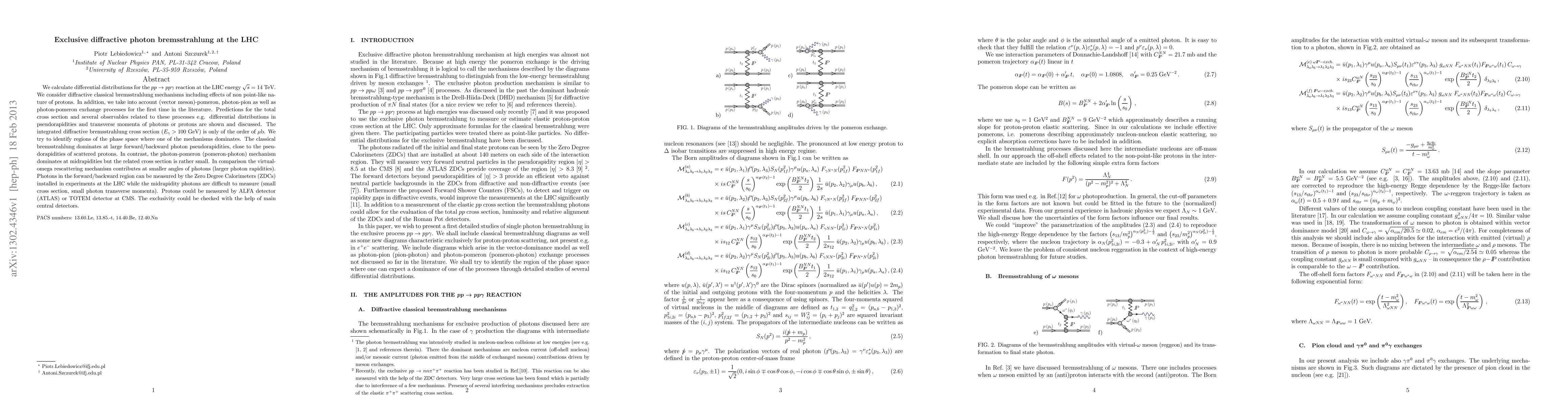 We calculate differential distributions for the $p p \to p p \gamma$ reaction at the LHC energy $\sqrt{s} = 14$ TeV. We consider diffractive classical bremsstrahlung mechanisms including effects of non point-like nature of protons. In addition, we take into account (vector meson)-pomeron, photon-pion as well as photon-pomeron exchange processes for the first time in the literature. Predictions for the total cross section and several observables related to these processes e.g. differential distributions in pseudorapidities and transverse momenta of photons or protons are shown and discussed. The integrated diffractive bremsstrahlung cross section ($E_{\gamma}>100$ GeV) is only of the order of $\mu$b. We try to identify regions of the phase space where one of the mechanisms dominates. The classical bremsstrahlung dominates at large forward/backward photon pseudorapidities, close to the pseudorapidities of scattered protons. In contrast, the photon-pomeron (pomeron-photon) mechanism dominates at midrapidities but the related cross section is rather small. In comparison the virtual-omega rescattering mechanism contributes at smaller angles of photons (larger photon rapidities). Photons in the forward/backward region can be measured by the Zero Degree Calorimeters (ZDCs) installed in experiments at the LHC while the midrapidity photons are difficult to measure (small cross section, small photon transverse momenta). Protons could be measured by ALFA detector (ATLAS) or TOTEM detector at CMS. The exclusivity could be checked with the help of main central detectors.