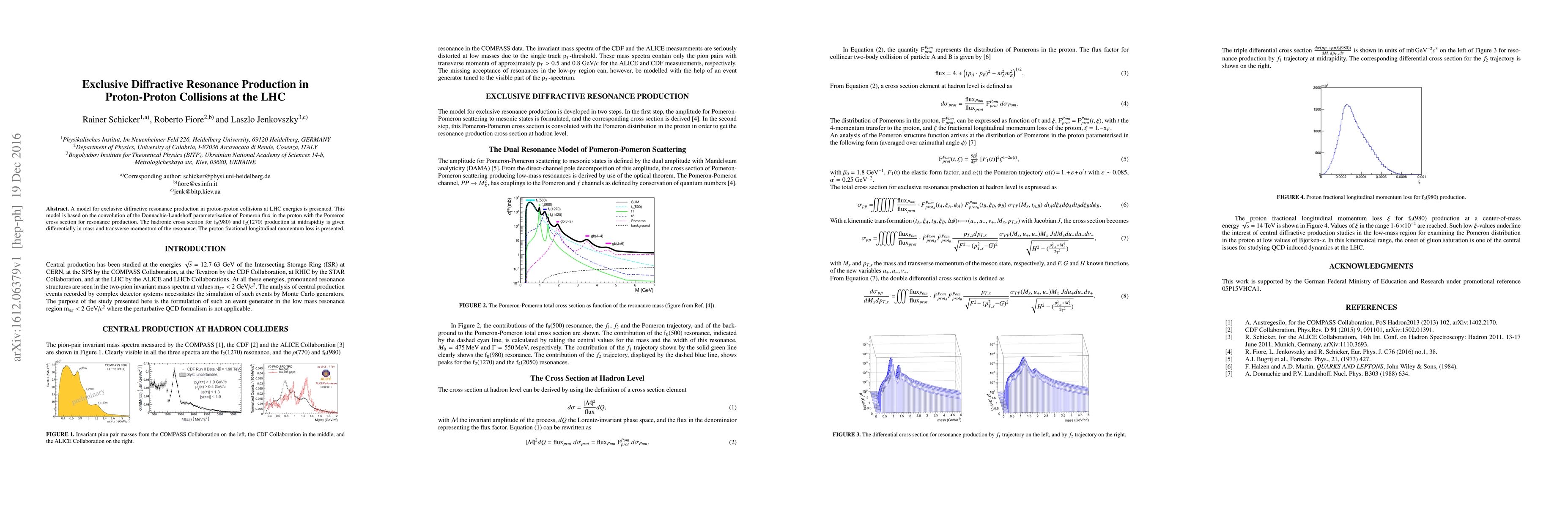 The research presents a model for exclusive diffractive resonance production in proton-proton collisions at LHC energies, based on the convolution of the Donnachie-Landshoff Pomeron flux parameterization in the proton with the Pomeron cross section for resonance production.
