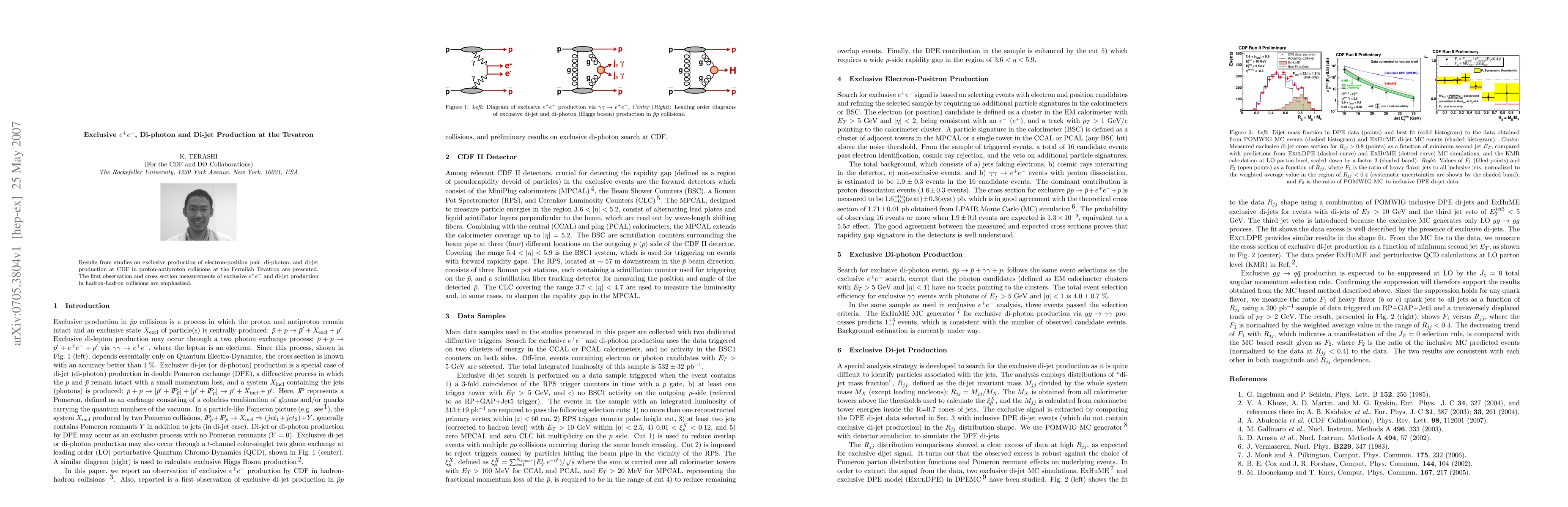 Summary: This paper reports the first observation and cross section measurements of exclusive e+e- and di-jet production in proton-antiproton collisions at the Tevatron, highlighting significant findings from the CDF experiment at Fermilab. These results contribute to our understanding of exclusive processes in hadron-hadron interactions.