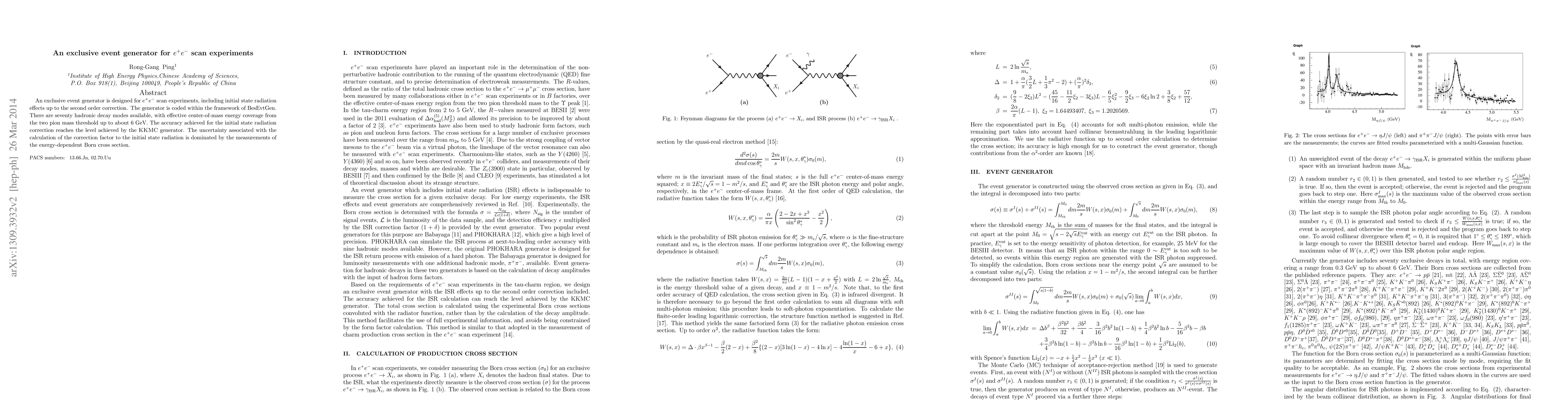 An exclusive event generator is designed for the $e^+e^-$ scan experiments with the initial state radiation effects up to the second order correction included. There are seventy hadronic decay modes available with the effective center-of-mass energy coverage from the two pion mass threshold up to about 6 GeV. The achieved accuracy of initial state radiation correction reaches the level the generator KKMC achieved. The uncertainty associated with the calculation of correction factor to the initial state radiation is dominated by the measurements of the energy-dependence Born cross section. The generator is coded within the framework of BesEvtGen.