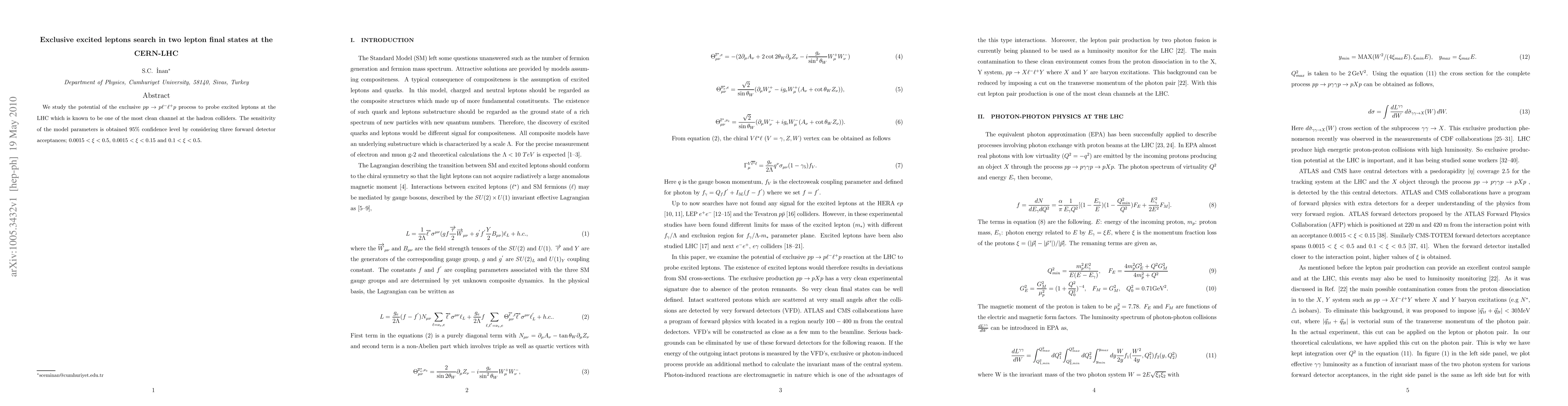 We study the potential of the exclusive $pp\to p\ell^-\ell^+p$ process to probe excited leptons at the LHC which is known to be one of the most clean channel at the hadron colliders. The sensitivity of the model parameters is obtained 95% confidence level by considering three forward detector acceptances; $0.0015< \xi < 0.5$, $0.0015< \xi <0.15$ and $0.1< \xi < 0.5$.