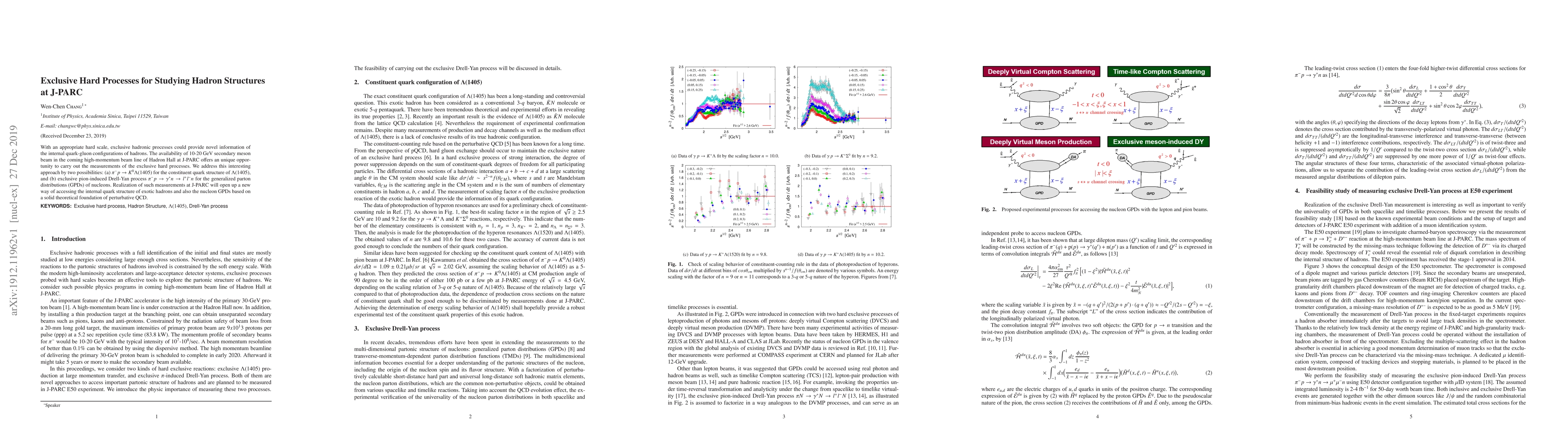 With an appropriate hard scale, exclusive hadronic processes could provide novel information of the internal quark-gluon configurations of hadrons. The availability of 10-20 GeV secondary meson beam in the coming high-momentum beam line of Hadron Hall at J-PARC offers an unique opportunity to carry out the measurements of the exclusive hard processes. We address this interesting approach by two possibilities: (a) $\pi^- p \to K^0 \Lambda(1405)$ for the constituent quark structure of $\Lambda(1405)$, and (b) exclusive pion-induced Drell-Yan process $\pi^- p \to \gamma^* n \to l^+ l^- n$ for the generalized parton distributions (GPDs) of nucleons. Realization of such measurements at J-PARC will open up a new way of accessing the internal quark structure of exotic hadrons and also the nucleon GPDs based on a solid theoretical foundation of perturbative QCD.