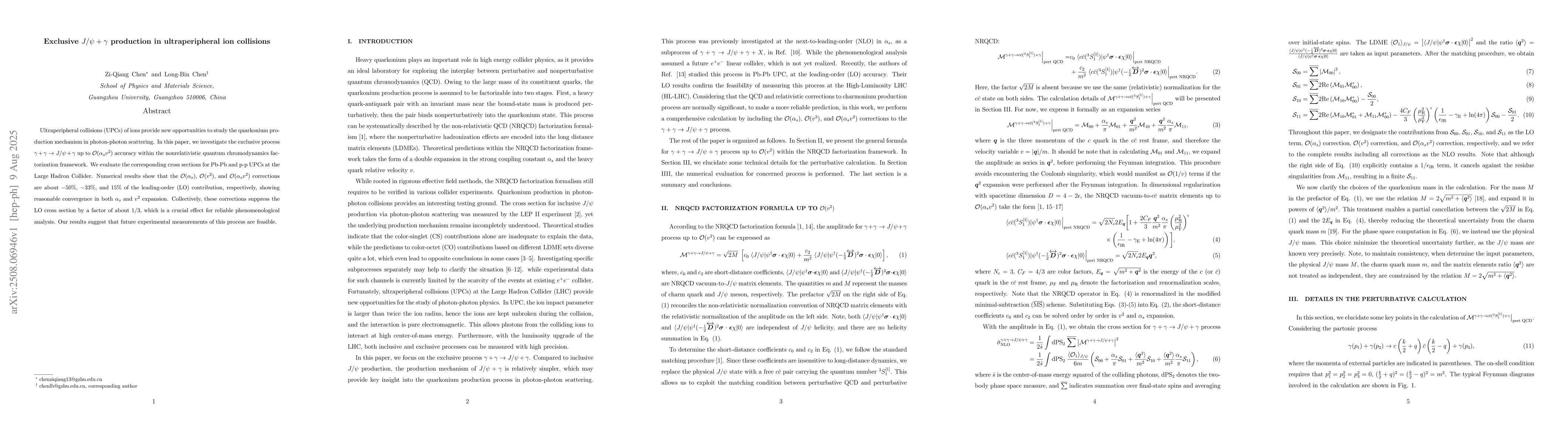 The research investigates the exclusive production of $J/\psi + \gamma$ in ultraperipheral ion collisions using the nonrelativistic QCD (NRQCD) factorization framework, calculating O($\alpha_s$), O($v^2$), and O($\alpha_sv^2$) corrections to the process $\gamma + \gamma \to J/\psi + \gamma$ for Pb-Pb and p-p UPCs at the Large Hadron Collider.