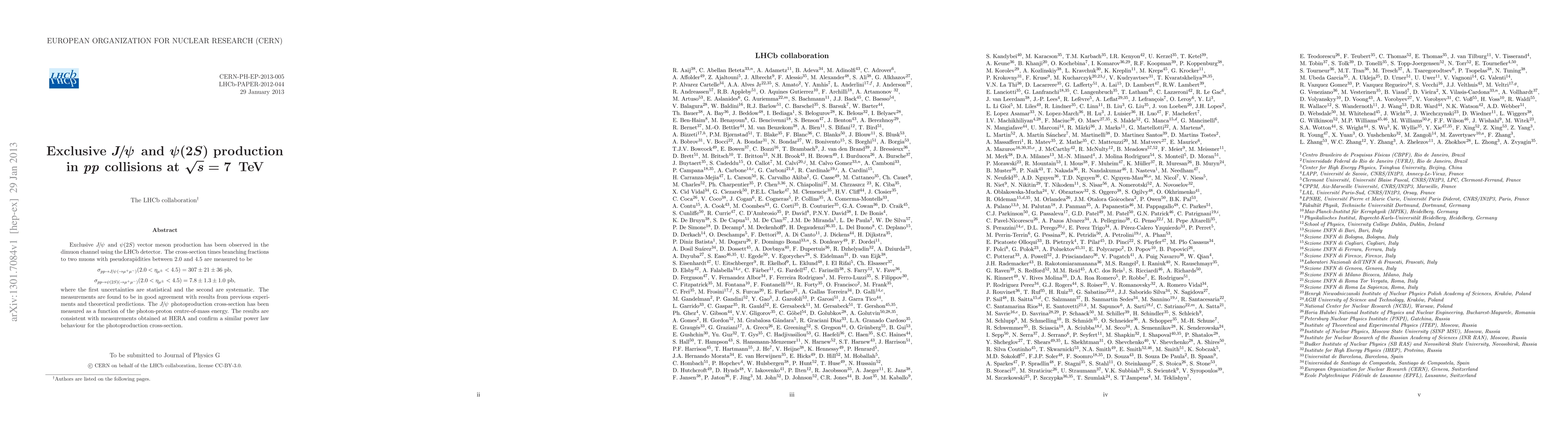 The LHCb detector observed exclusive $J/\psi$ and $\psi(2S)$ vector meson production in the dimuon channel at $\sqrt{s}=7$ TeV, with cross-sections of $307 \pm 21 \pm 36$ pb and $7.8 \pm 1.3 \pm 1.0$ pb respectively, showing good agreement with previous experiments and theoretical predictions. The $J/\psi$ photoproduction cross-section also aligns with HERA measurements, confirming a similar power law behaviour.