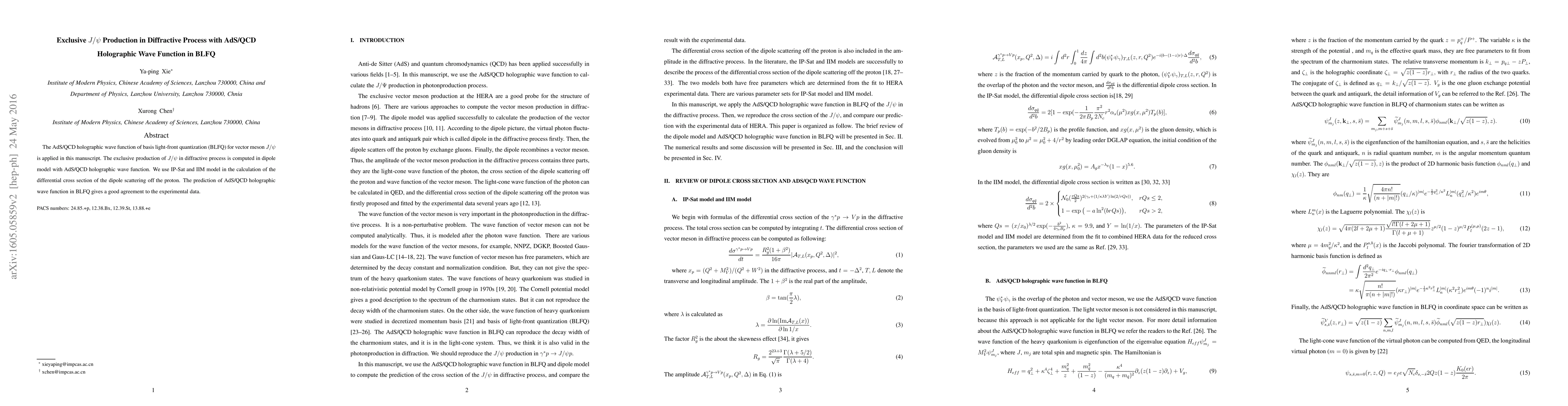 This paper applies the AdS/QCD holographic wave function from basis light-front quantization (BLFQ) to compute the exclusive $J/\psi$ production in diffractive processes. The differential cross section is calculated using IP-Sat and IIM models, showing good agreement with experimental data.