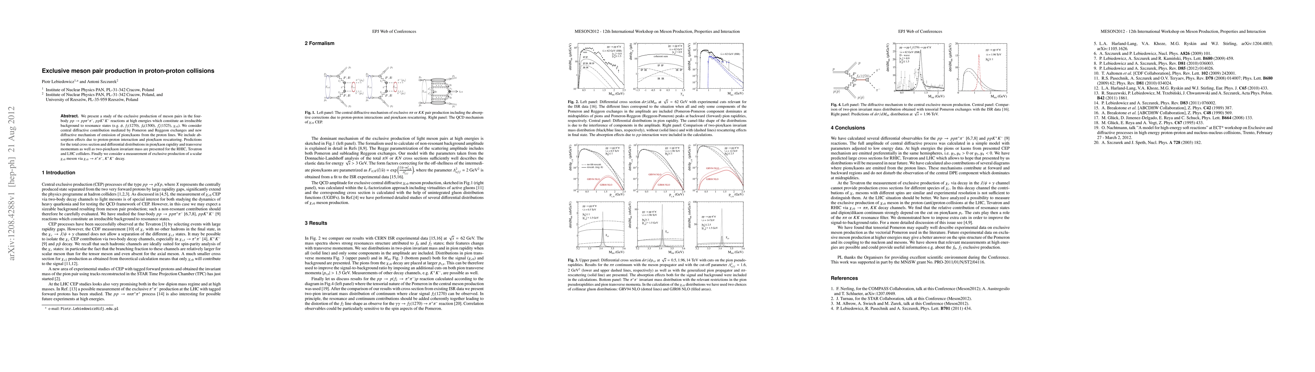 The study considers central diffractive contribution mediated by Pomeron and Reggeon exchanges, along with a new diffractive mechanism of emission of pions/kaons from the proton lines. It includes absorption effects due to proton-proton interaction and pion/kaon rescattering.