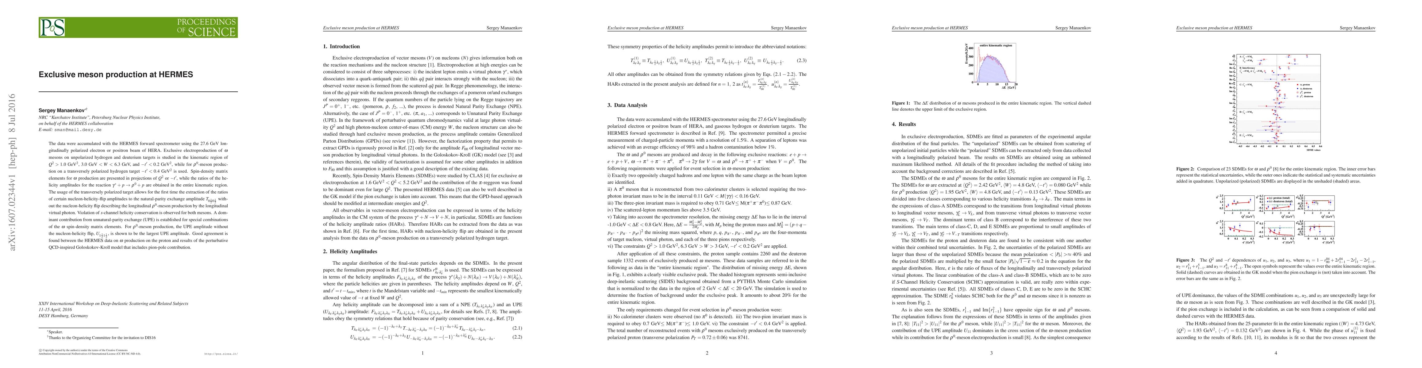 This paper investigates exclusive meson production using the HERMES spectrometer with polarized electron/positron beams, focusing on $\omega$ and $\rho^0$ mesons. It observes violations of $s$-channel helicity conservation and identifies dominant unnatural-parity exchange contributions, particularly in $\rho^0$ meson production.