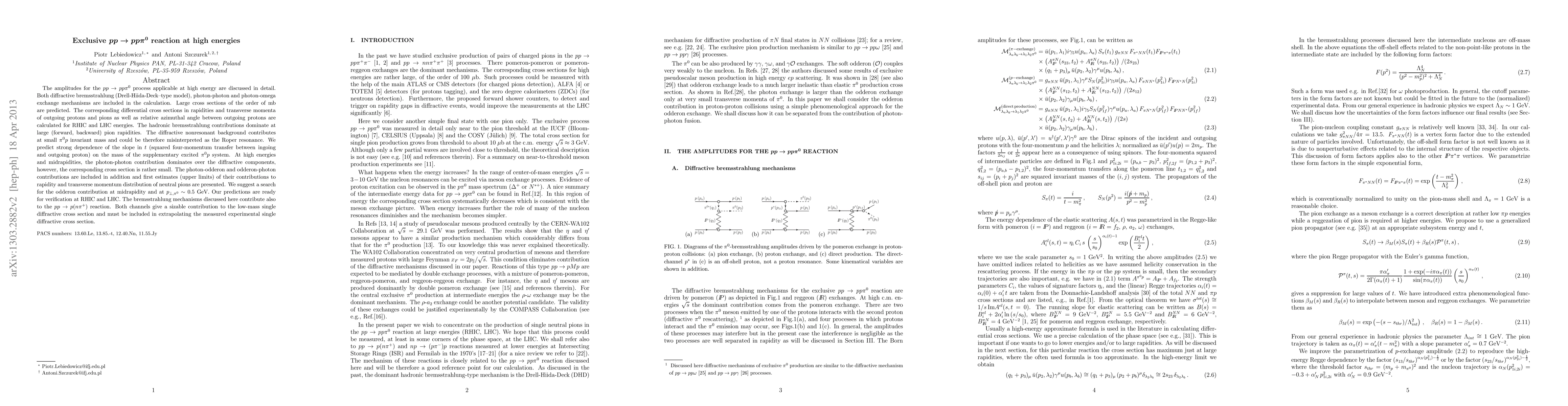 This paper discusses the high-energy $p p \to p p \pi^{0}$ reaction, predicting large cross sections and detailing contributions from diffractive bremsstrahlung, photon-photon, and photon-omega exchange mechanisms. It suggests a search for odderon contributions at midrapidity and low transverse momentum.