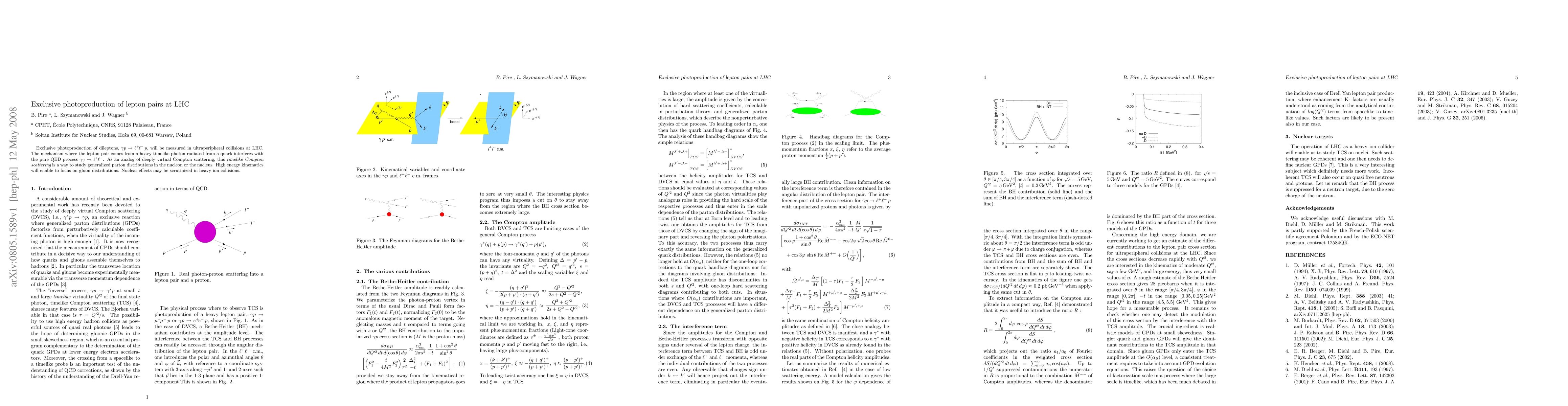 Exclusive photoproduction of dileptons, gamma p ->l+ l- p, will be measured in ultraperipheral collisions at LHC. The mechanism where the lepton pair comes from a heavy timelike photon radiated from a quark interferes with the pure QED process gamma gamma ->l+ l- As an analog of deeply virtual Compton scattering, this timelike Compton scattering is a way to study generalized parton distributions in the nucleon or the nucleus. High energy kinematics will enable to focus on gluon distributions. Nuclear effects may be scrutinized in heavy ion collisions.