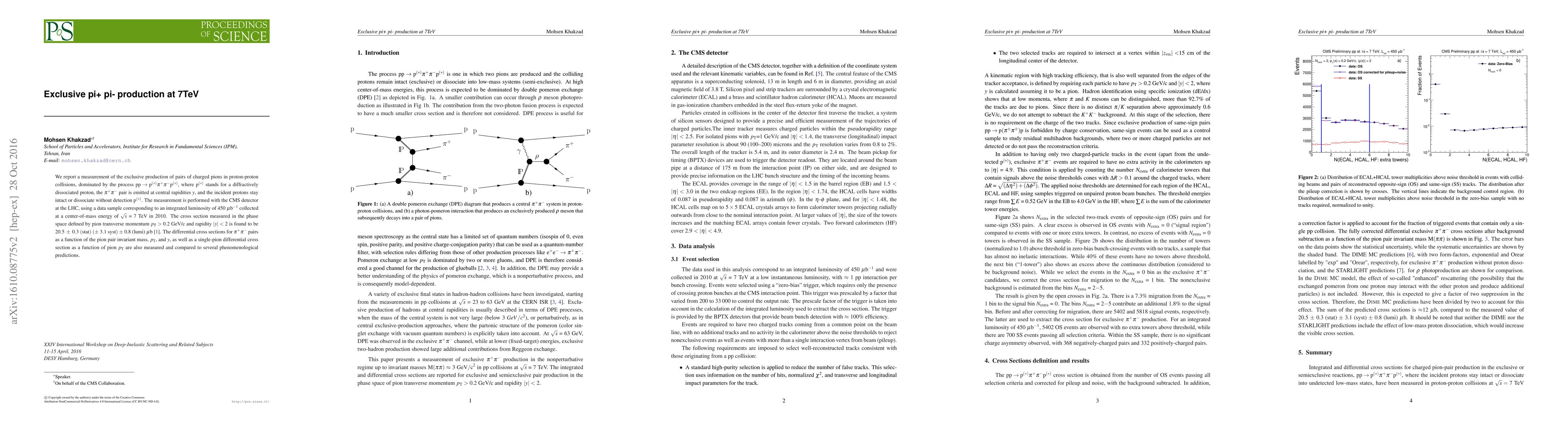 This paper reports on the exclusive production of charged pion pairs in proton-proton collisions at 7 TeV, measured using the CMS detector at the LHC. The cross section for the process is found to be 20.5 ± 0.3 (stat) ± 3.1 (syst) ± 0.8 (lumi) µb, and differential cross sections are compared with phenomenological predictions.