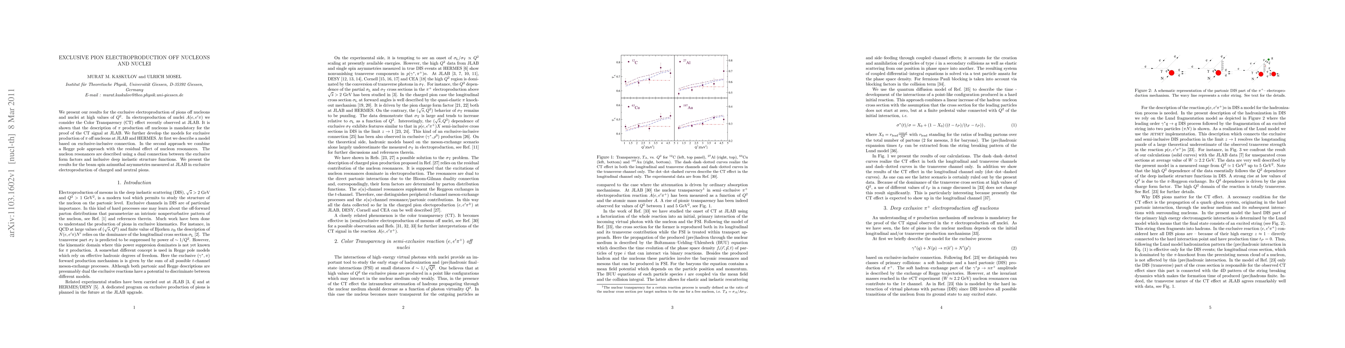 This paper explores the exclusive electroproduction of pions off nucleons and nuclei at high $Q^2$ values, emphasizing the Color Transparency effect observed at JLAB. It develops models combining exclusive-inclusive connections and Regge poles, and presents results on beam spin azimuthal asymmetries for charged and neutral pions measured at JLAB.