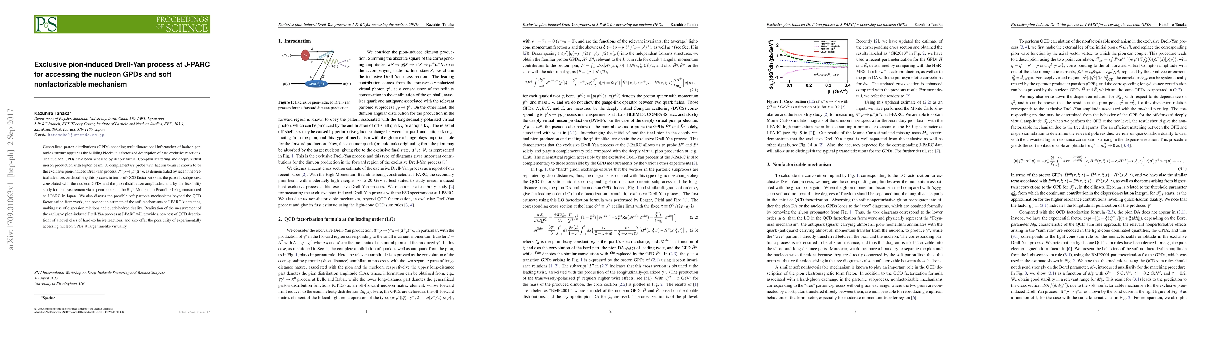 This paper explores the exclusive pion-induced Drell-Yan process at J-PARC to access nucleon generalized parton distributions (GPDs) and examines soft nonfactorizable mechanisms. The study aims to provide a new QCD test and experimentally access nucleon GPDs using a hadron beam.