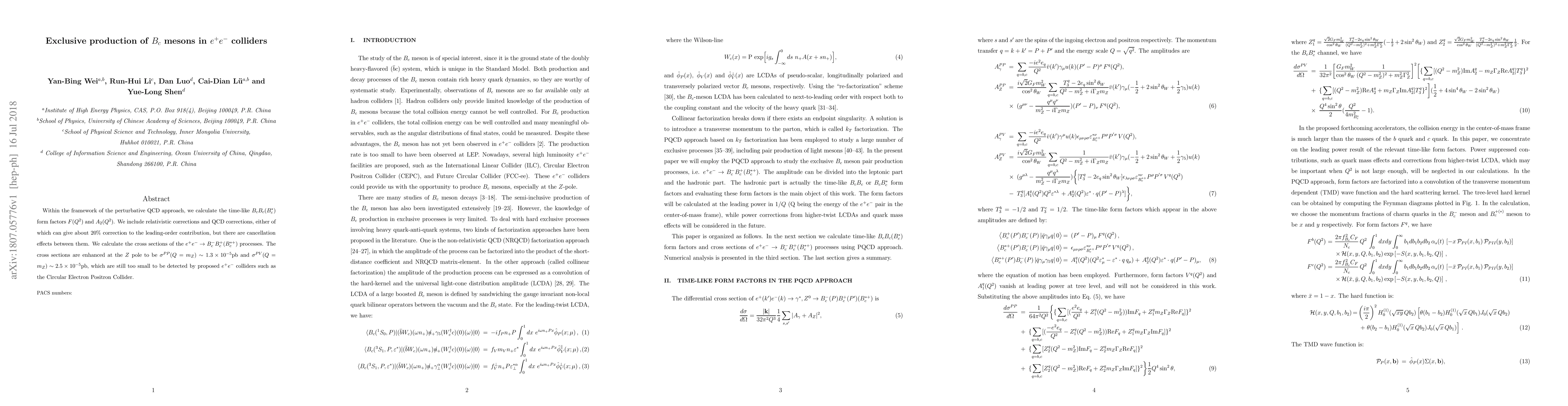 Within the framework of the perturbative QCD approach, we calculate the time-like $B_cB_c(B_c^*)$ form factors $F(Q^2)$ and $A_2(Q^2)$. We include relativistic corrections and QCD corrections, either of which can give about $20\%$ correction to the leading-order contribution, but there are cancellation effects between them. We calculate the cross sections of the $e^+e^-\to B_c^-B_c^+(B_c^{*+})$ processes. The cross sections are enhanced at the $Z$ pole to be $\sigma^{PP}(Q=m_Z) \sim 1.3\times10^{-5}\text{pb}$ and $\sigma^{PV}(Q=m_Z) \sim 2.5\times10^{-5}\text{pb}$, which are still too small to be detected by proposed $e^+e^-$ colliders such as the Circular Electron Positron Collider.