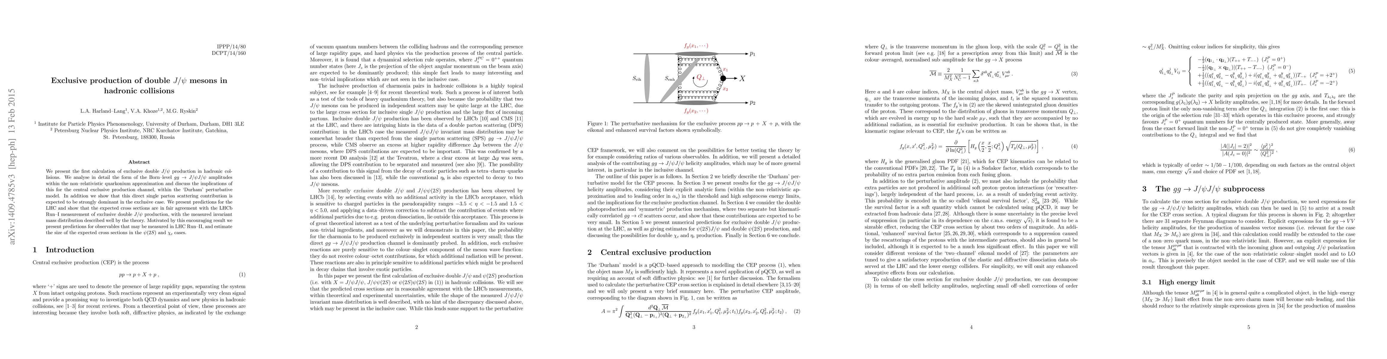 We present the first calculation of exclusive double $J/\psi$ production in hadronic collisions. We analyse in detail the form of the Born-level $gg \to J/\psi J/\psi$ amplitudes within the non-relativistic quarkonium approximation and discuss the implications of this for the central exclusive production channel, within the `Durham' perturbative model. In addition we show that this direct single parton scattering contribution is expected to be strongly dominant in the exclusive case. We present predictions for the LHC and show that the expected cross sections are in reasonable agreement with the LHCb Run-I measurement of exclusive double $J/\psi$ production, with the measured invariant mass distribution described well by the theory. Motivated by this encouraging result we present predictions for observables that may be measured in LHC Run-II, and estimate the size of the expected cross sections in the $\psi(2S)$ and $\chi_{c}$ cases.