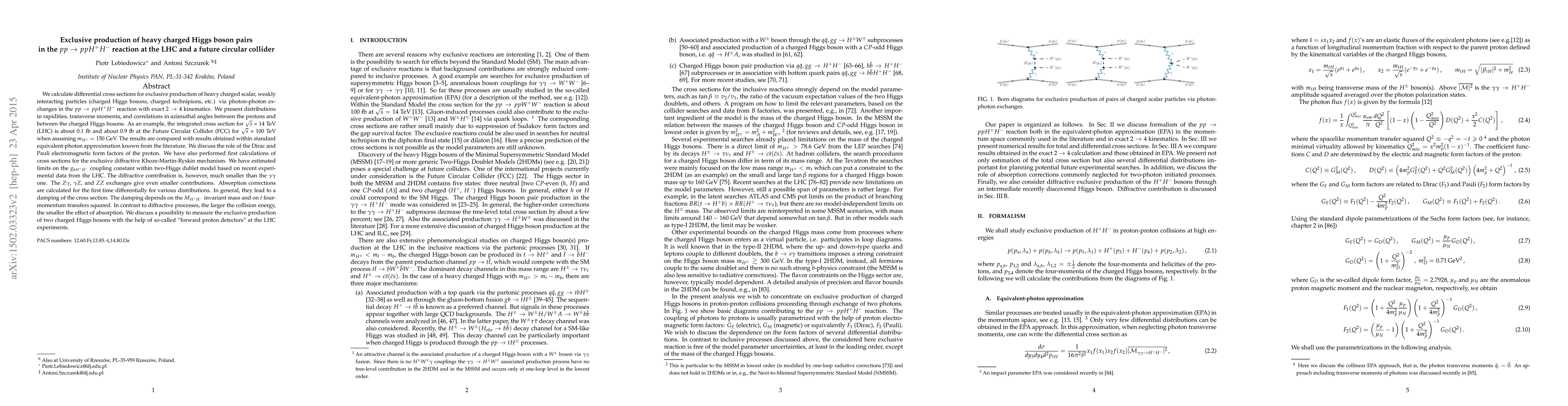 We calculate differential cross sections for exclusive production of heavy charged scalar, weakly interacting particles (charged Higgs bosons, charged technipions, etc.) via photon-photon exchanges in the $p p \to p p H^+ H^-$ reaction with exact $2 \to 4$ kinematics. We present distributions in rapidities, transverse momenta, and correlations in azimuthal angles between the protons and between the charged Higgs bosons. As an example, the integrated cross section for $\sqrt{s}$ = 14~TeV (LHC) is about 0.1~fb and about 0.9~fb at the Future Circular Collider (FCC) for $\sqrt{s}$ = 100~TeV when assuming $m_{H^{\pm}} = 150$~GeV. The results are compared with results obtained within standard equivalent-photon approximation known from the literature. We discuss the role of the Dirac and Pauli electromagnetic form factors of the proton. We have also performed first calculations of cross sections for the exclusive diffractive Khoze-Martin-Ryskin mechanism. We have estimated limits on the $g_{h H^+ H^-}$ coupling constant within two-Higgs dublet model based on recent experimental data from the LHC. The diffractive contribution is, however, much smaller than the $\gamma \gamma$ one. The $Z \gamma$, $\gamma Z$, and $ZZ$ exchanges give even smaller contributions. Absorption corrections are calculated for the first time differentially for various distributions. In general, they lead to a damping of the cross section. The damping depends on the $M_{H^{+}H^{-}}$ invariant mass and on $t$ four-momentum transfers squared. In contrast to diffractive processes, the larger the collision energy, the smaller the effect of absorption. We discuss a possibility to measure the exclusive production of two charged Higgs bosons with the help of so-called "forward proton detectors" at the LHC experiments.