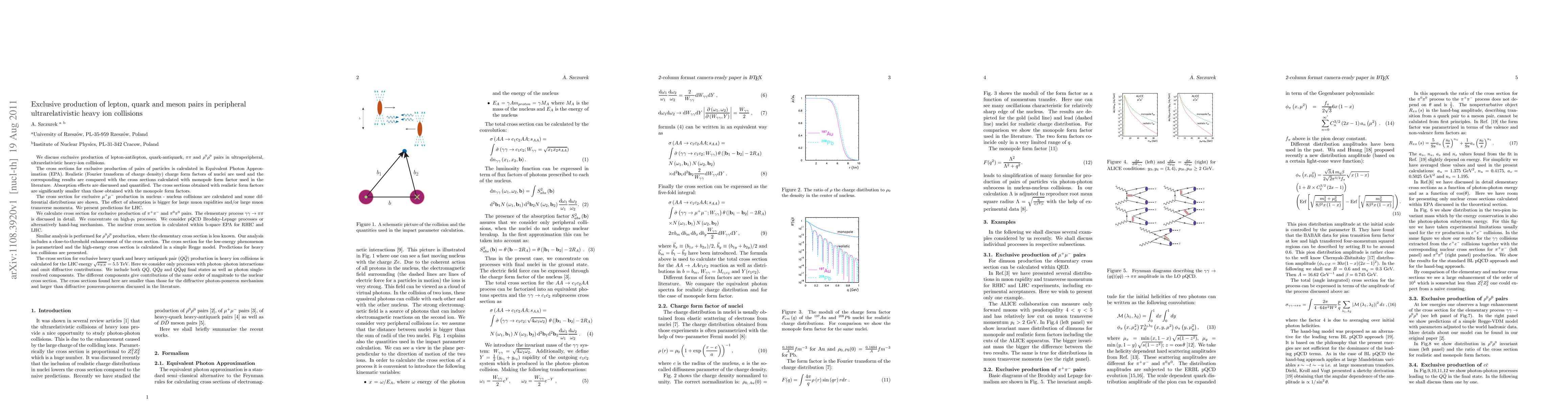 We discuss exclusive production of lepton-antilepton, quark-antiquark, $\pi \pi$ and $\rho^0 \rho^0$ pairs in ultraperipheral, ultrarelativistic heavy-ion collisions. The cross sections for exclusive production of pairs of particles is calculated in Equivalent Photon Approximation (EPA). Realistic (Fourier transform of charge density) charge form factors of nuclei are used and the corresponding results are compared with the cross sections calculated with monopole form factor used in the literature. Absorption effects are discussed and quantified. The cross sections obtained with realistic form factors are significantly smaller than those obtained with the monopole form factors.