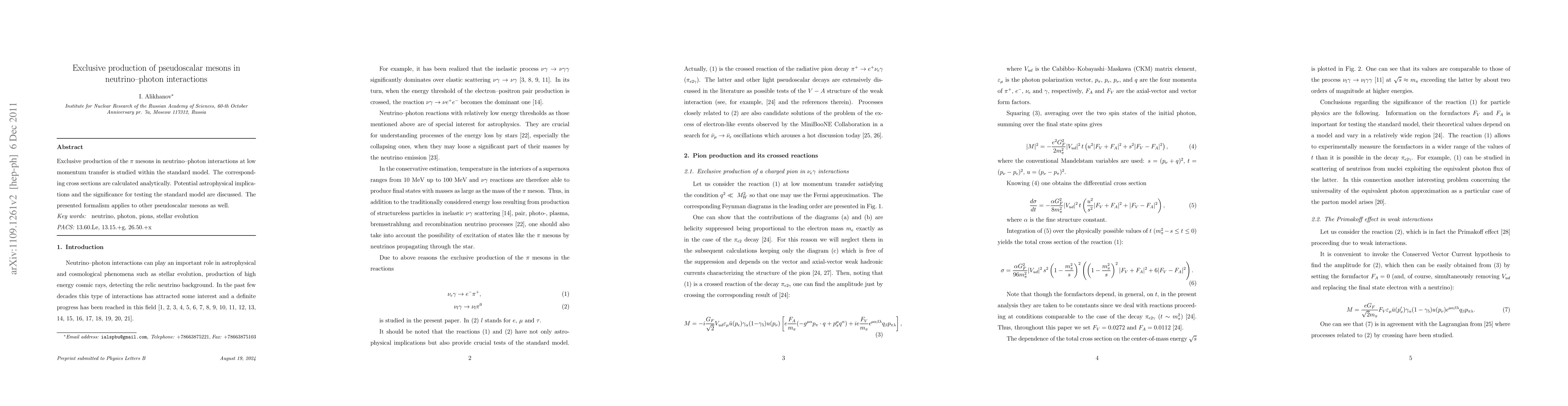 Exclusive production of the $\pi$ mesons in neutrino--photon interactions at low momentum transfer is studied within the standard model. The corresponding cross sections are calculated analytically. Potential astrophysical implications and the significance for testing the standard model are discussed. The presented formalism applies to other pseudoscalar mesons as well.