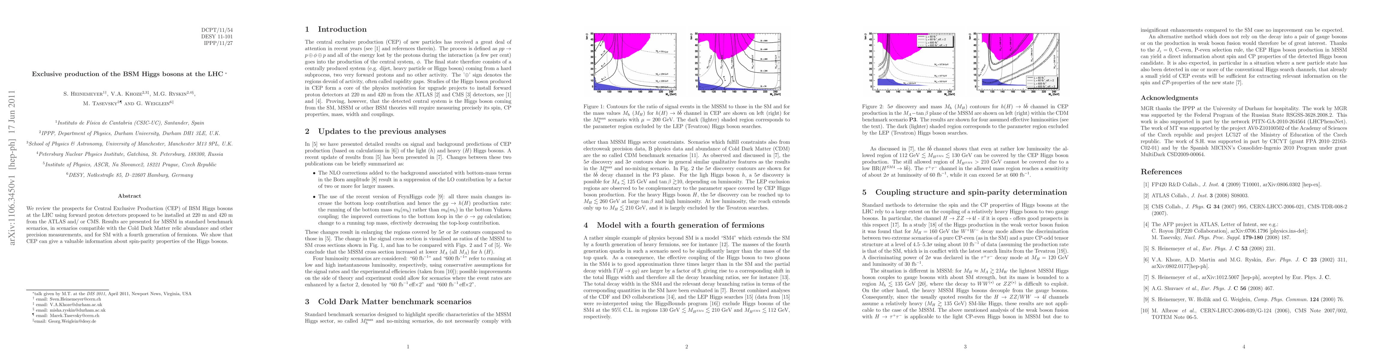 We review the prospects for Central Exclusive Production (CEP) of BSM Higgs bosons at the LHC using forward proton detectors proposed to be installed at 220 m and 420 m from the ATLAS and/ or CMS. Results are presented for MSSM in standard benchmark scenarios, in scenarios compatible with the Cold Dark Matter relic abundance and other precision measurements, and for SM with a fourth generation of fermions. We show that CEP can give a valuable information about spin-parity properties of the Higgs bosons.
