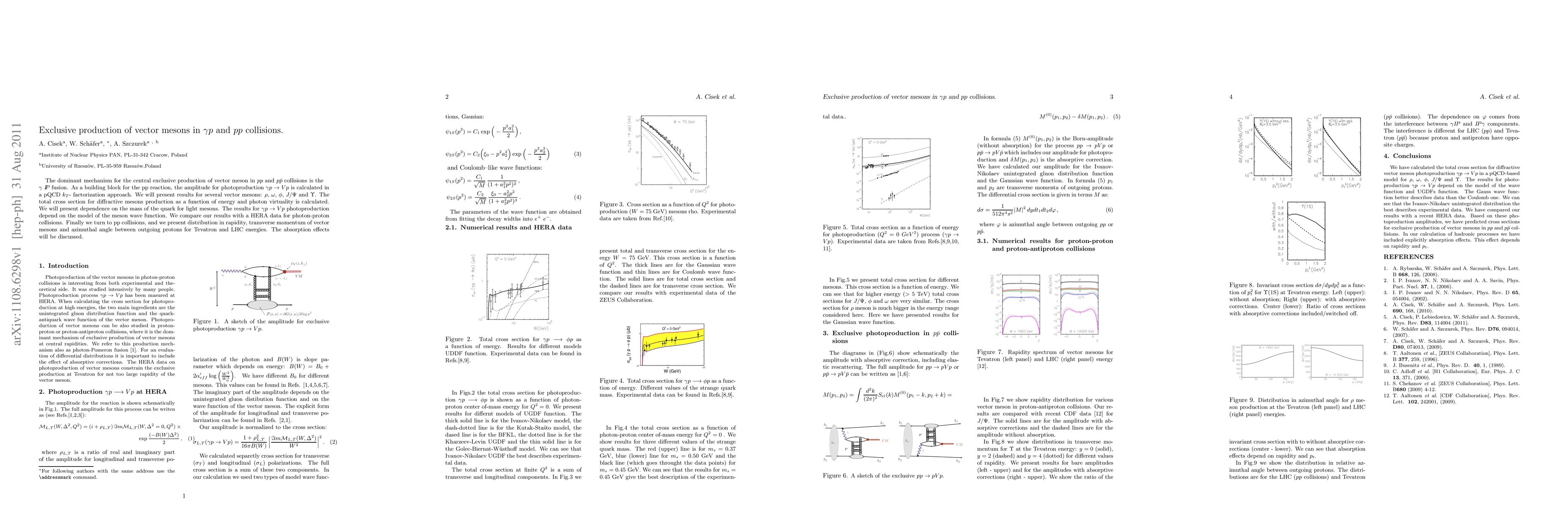 The dominant mechanism for the central exclusive production of vector meson in $p p$ and $p \bar p$ collisions is the $\gamma$ $I P$ fusion. As a building block for the pp reaction, the amplitude for photoproduction $ \gamma p \to V p $ is calculated in a pQCD $k_{T}$- factorization approach. We will present results for several vector mesons: $\rho$, $\omega$, $\phi$, $J/\Psi$ and $\Upsilon$. The total cross section for diffractive mesons production as a function of energy and photon virtuality is calculated. We will present dependence on the mass of the quark for light mesons. The results for $ \gamma p \to V p $ photoproduction depend on the model of the meson wave function. We compare our results with a HERA data for photon-proton collisions. Finally we turn to pp collisions, and we present distribution in rapidity, transverse momentum of vector mesons and azimuthal angle between outgoing protons for Tevatron and LHC energies. The absorption effects will be discussed.