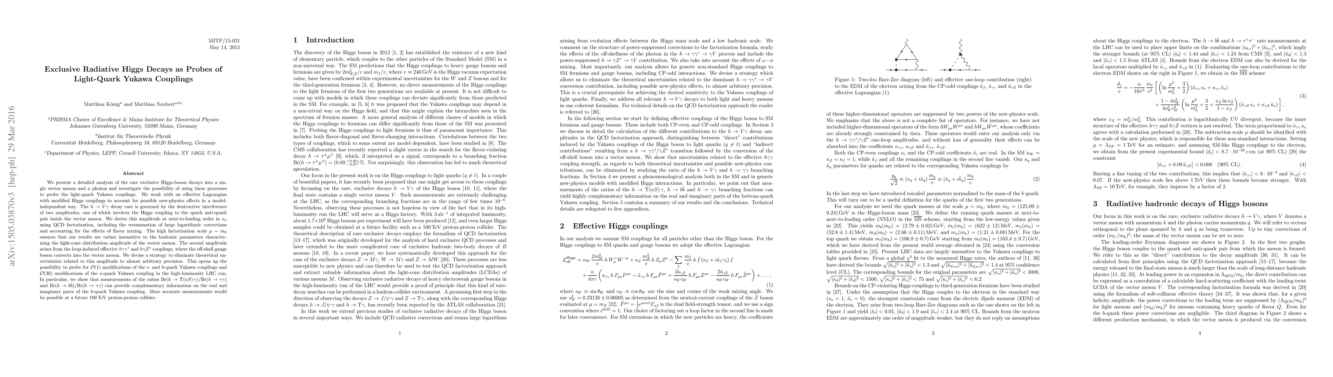 This paper analyzes rare exclusive Higgs-boson decays into a vector meson and a photon to probe light-quark Yukawa couplings, using an effective Lagrangian and next-to-leading order QCD factorization. The study reveals potential to detect significant modifications in c-, b-, and s-quark Yukawa couplings, with future colliders offering even greater precision.