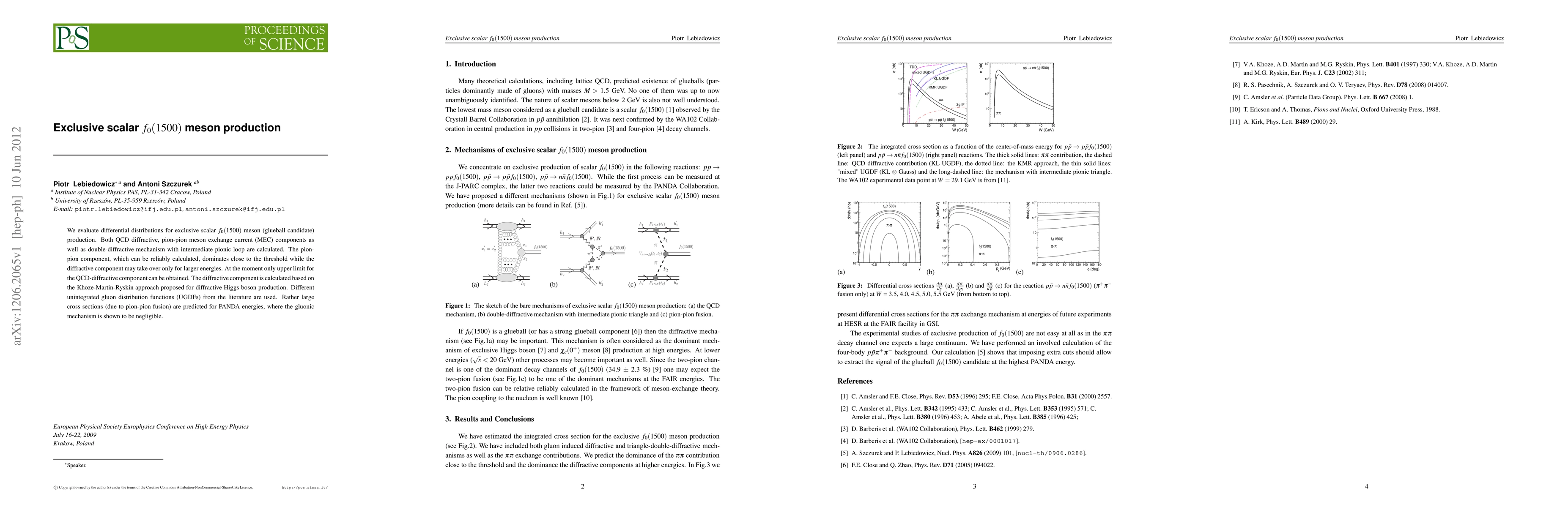 We evaluate differential distributions for exclusive scalar $f_0(1500)$ meson (glueball candidate) production. Both QCD diffractive, pion-pion meson exchange current (MEC) components as well as double-diffractive mechanism with intermediate pionic loop are calculated. The pion-pion component, which can be reliably calculated, dominates close to the threshold while the diffractive component may take over only for larger energies. At the moment only upper limit for the QCD-diffractive component can be obtained. The diffractive component is calculated based on the Khoze-Martin-Ryskin approach proposed for diffractive Higgs boson production. Different unintegrated gluon distribution functions (UGDFs) from the literature are used. Rather large cross sections (due to pion-pion fusion) are predicted for PANDA energies, where the gluonic mechanism is shown to be negligible.
