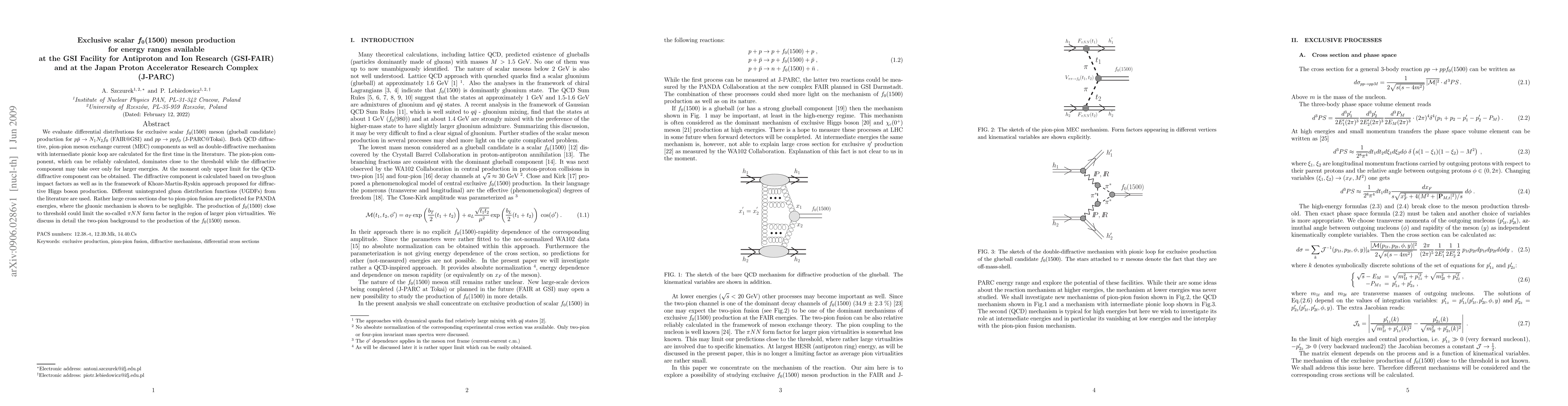 We evaluate differential distributions for exclusive scalar $f_0(1500)$ meson (glueball candidate) production for $p \bar p \to N_1 N_2 f_0$ (FAIR@GSI) and $p p \to p p f_0$ (J-PARC@Tokai). Both QCD diffractive, pion-pion meson exchange current (MEC) components as well as double-diffractive mechanism with intermediate pionic loop are calculated for the first time in the literature. The pion-pion component, which can be reliably calculated, dominates close to the threshold while the diffractive component may take over only for larger energies. At the moment only upper limit for the QCD-diffractive component can be obtained. The diffractive component is calculated based on two-gluon impact factors as well as in the framework of Khoze-Martin-Ryskin approach proposed for diffractive Higgs boson production. Different unintegrated gluon distribution functions (UGDFs) from the literature are used. Rather large cross sections due to pion-pion fusion are predicted for PANDA energies, where the gluonic mechanism is shown to be negligible. The production of $f_0(1500)$ close to threshold could limit the so-called $\pi NN$ form factor in the region of larger pion virtualities. We discuss in detail the two-pion background to the production of the $f_0(1500)$ meson. We compare our result with the existing data of %the WA102 Collaboration.
