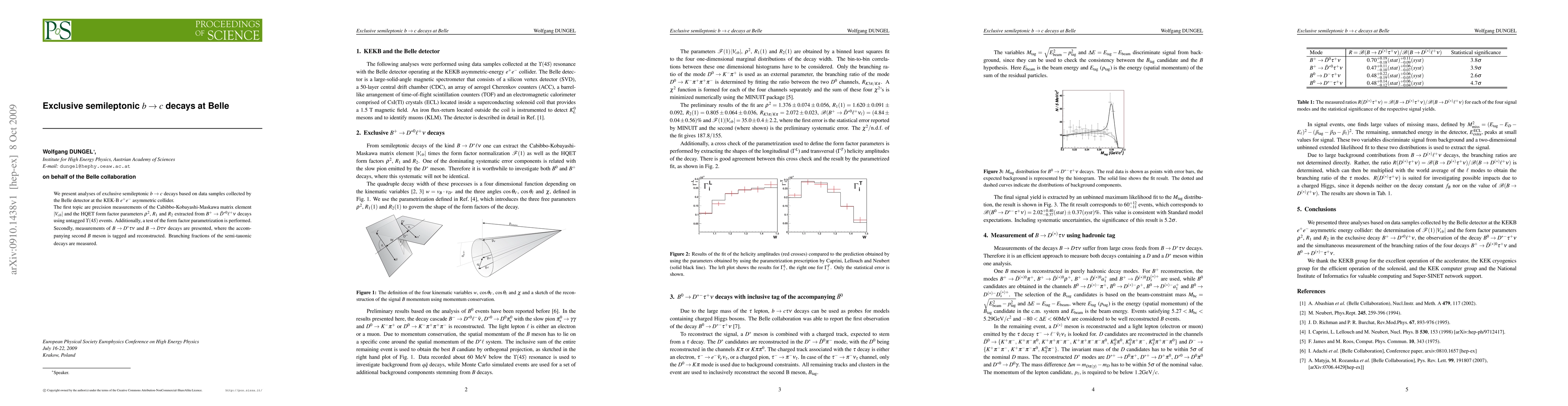 We present analyses of exclusive semileptonic b -> c decays based on data samples collected by the Belle detector at the KEK-B e+ e- asymmetric collider. The first topic are precision measurements of the Cabibbo-Kobayashi-Maskawa matrix element |V_{cb}| and the HQET form factor parameters \rho^2, R_1 and R_2 extracted from B^+ -> \bar{D}^{*0} \ell^+ \nu decays using untagged Upsilon(4S) events. Additionally, a test of the form factor parametrization is performed. Secondly, measurements of B -> D^* \tau \nu and B -> D \tau \nu decays are presented, where the accompanying second B meson is tagged and reconstructed. Branching fractions of the semi-tauonic decays are measured.