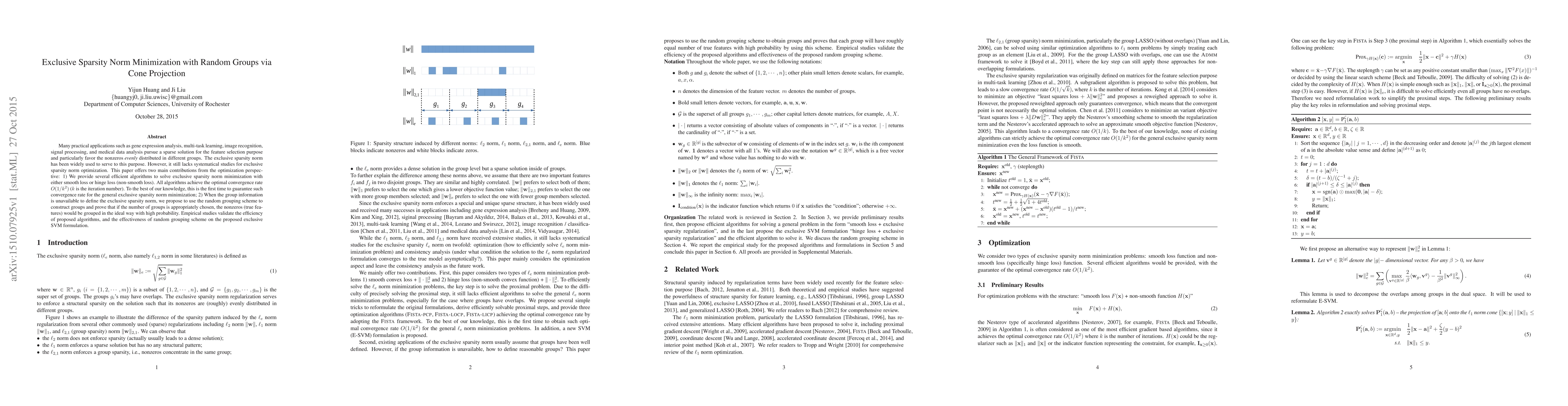 Many practical applications such as gene expression analysis, multi-task learning, image recognition, signal processing, and medical data analysis pursue a sparse solution for the feature selection purpose and particularly favor the nonzeros \emph{evenly} distributed in different groups. The exclusive sparsity norm has been widely used to serve to this purpose. However, it still lacks systematical studies for exclusive sparsity norm optimization. This paper offers two main contributions from the optimization perspective: 1) We provide several efficient algorithms to solve exclusive sparsity norm minimization with either smooth loss or hinge loss (non-smooth loss). All algorithms achieve the optimal convergence rate $O(1/k^2)$ ($k$ is the iteration number). To the best of our knowledge, this is the first time to guarantee such convergence rate for the general exclusive sparsity norm minimization; 2) When the group information is unavailable to define the exclusive sparsity norm, we propose to use the random grouping scheme to construct groups and prove that if the number of groups is appropriately chosen, the nonzeros (true features) would be grouped in the ideal way with high probability. Empirical studies validate the efficiency of proposed algorithms, and the effectiveness of random grouping scheme on the proposed exclusive SVM formulation.