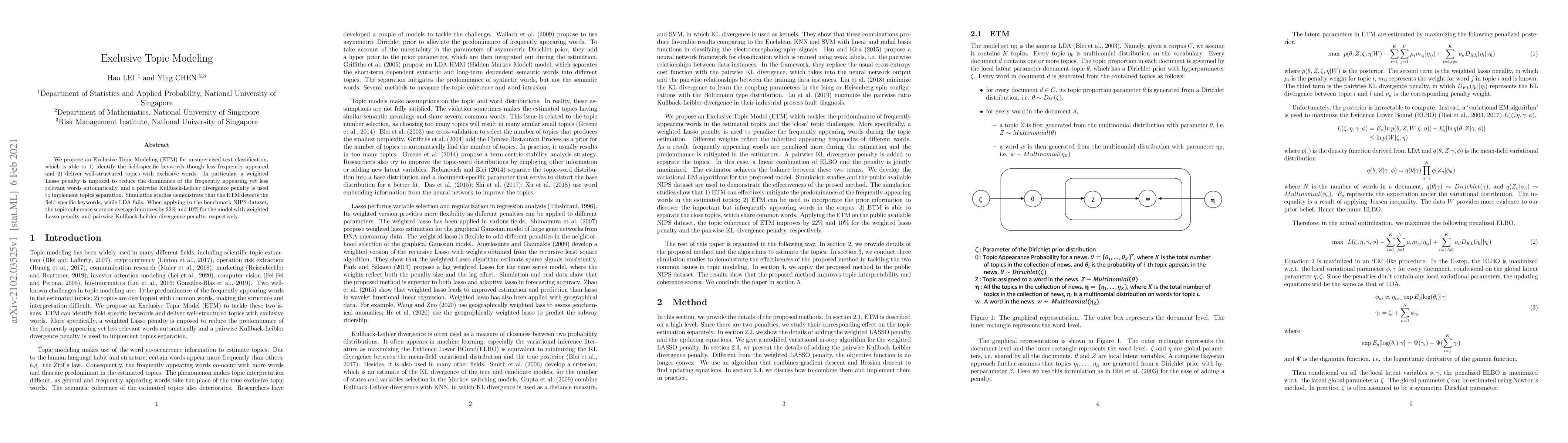 We propose an Exclusive Topic Modeling (ETM) for unsupervised text classification, which is able to 1) identify the field-specific keywords though less frequently appeared and 2) deliver well-structured topics with exclusive words. In particular, a weighted Lasso penalty is imposed to reduce the dominance of the frequently appearing yet less relevant words automatically, and a pairwise Kullback-Leibler divergence penalty is used to implement topics separation. Simulation studies demonstrate that the ETM detects the field-specific keywords, while LDA fails. When applying to the benchmark NIPS dataset, the topic coherence score on average improves by 22% and 10% for the model with weighted Lasso penalty and pairwise Kullback-Leibler divergence penalty, respectively.