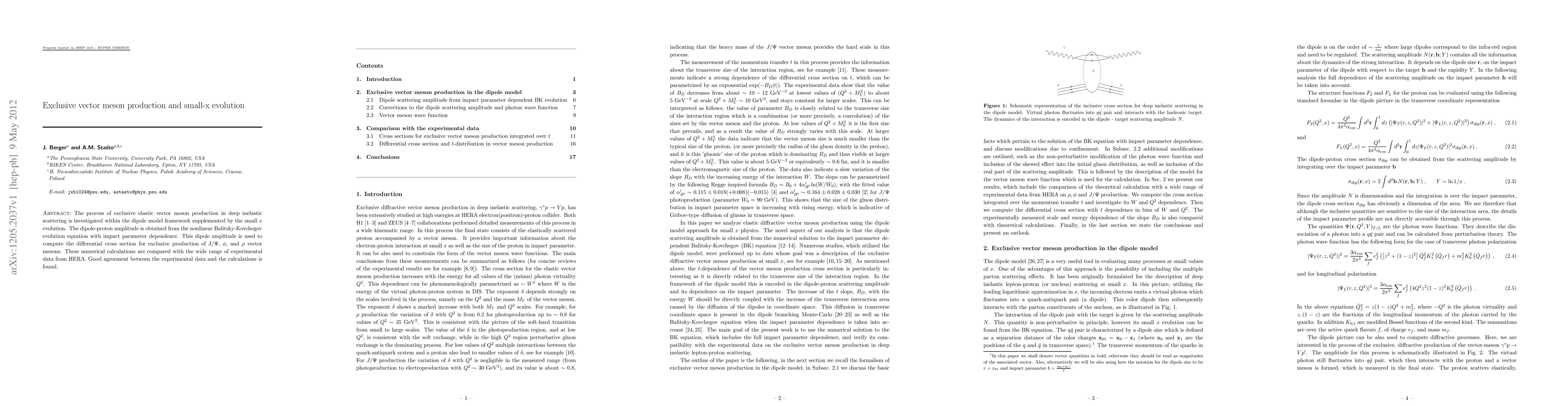This paper investigates exclusive vector meson production in deep inelastic scattering using the dipole model and small-x evolution, achieving good agreement between theoretical calculations and HERA experimental data for J/\Psi, \phi, and \rho mesons.