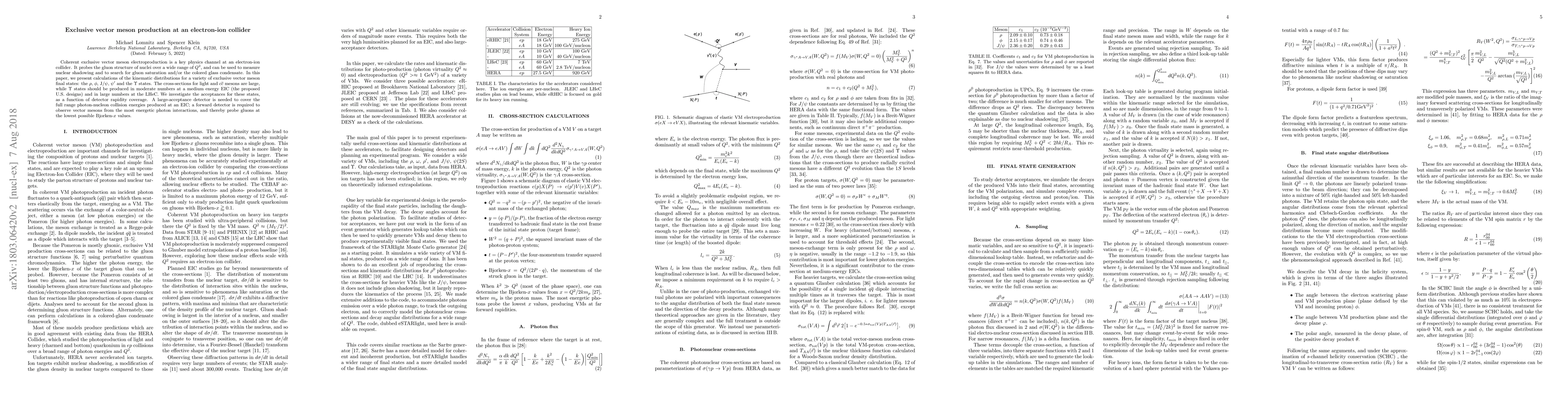 This paper investigates the production of various exclusive vector mesons ($\rho$, $\phi$, J/$\psi$, $\psi'$, $\Upsilon$) at an electron-ion collider, focusing on their kinematic distributions and cross-sections. It highlights the need for a large-acceptance detector to fully explore the range of photon-nucleon collision energies.