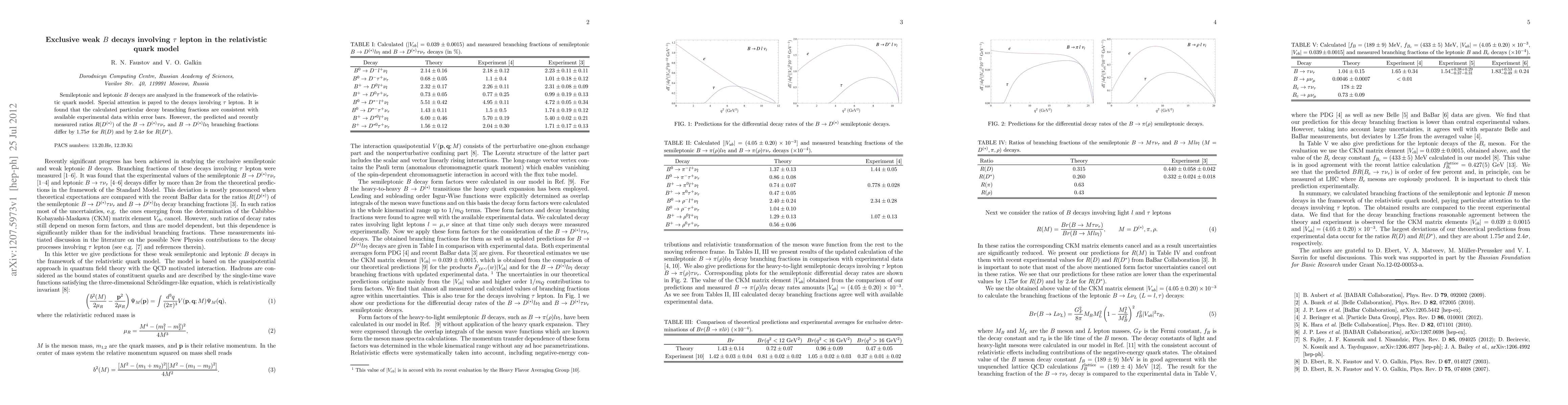 Semileptonic and leptonic B decays are analyzed in the framework of the relativistic quark model. Special attention is payed to the decays involving $\tau$ lepton. It is found that the calculated particular decay branching fractions are consistent with available experimental data within error bars. However, the predicted and recently measured ratios $R(D^{(*)})$ of the $B\to D^{(*)}\tau\nu_\tau$ and $B\to D^{(*)}l\nu_l$ branching fractions differ by 1.75$\sigma$ for $R(D)$ and by 2.4$\sigma$ for $R(D^*)$.