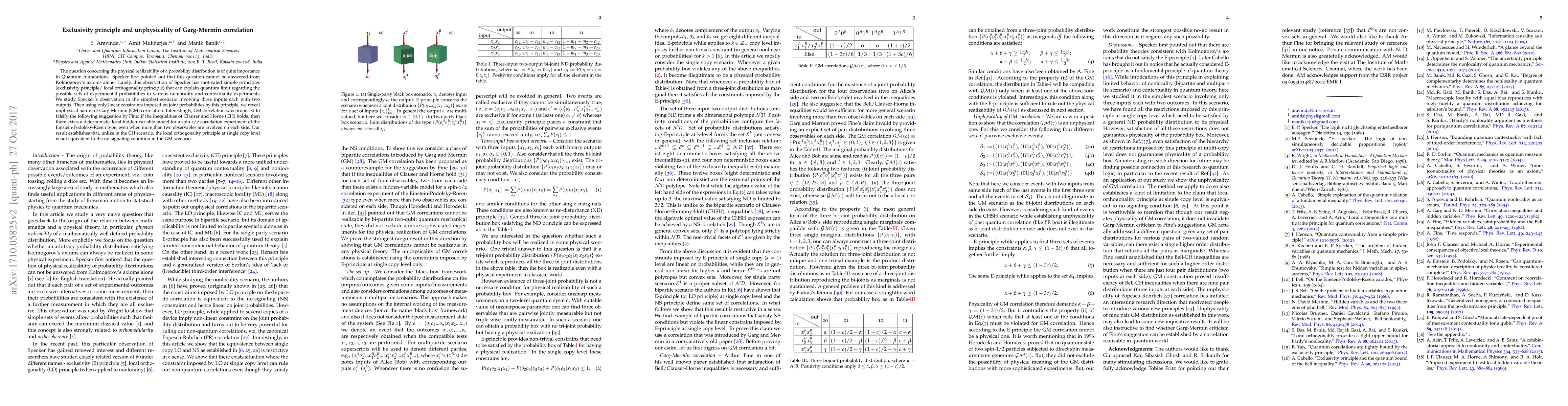 The question concerning the physical realizability of a probability distribution is of quite importance in Quantum foundations. Specker first pointed out that this question cannot be answered from Kolmogorov's axioms alone. Lately, this observation of Specker has motivated simple principles (exclusivity principle/ local orthogonality principle) that can explain quantum limit regarding the possible sets of experimental probabilities in various nonlocality and contextuality experiments. We study Specker's observation in the simplest scenario involving three inputs each with two outputs. Then using only linear constraints imposed on joint probabilities by this principle, we reveal unphysical nature of Garg-Mermin (GM) correlation. Interestingly, GM correlation was proposed to falsify the following suggestion by Fine: if the inequalities of Clauser and Horne (CH) holds, then there exists a deterministic local hidden-variable model for a spin-1/2 correlation experiment of the Einstein-Podolsky-Rosen type, even when more than two observables are involved on each side. Our result establishes that, unlike in the CH scenario, the local orthogonality principle at single copy level is not equivalent to the no-signaling condition in the GM scenario.