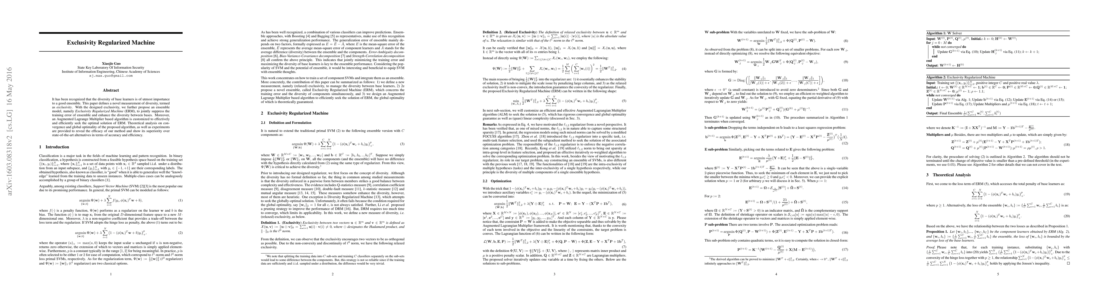 It has been recognized that the diversity of base learners is of utmost importance to a good ensemble. This paper defines a novel measurement of diversity, termed as exclusivity. With the designed exclusivity, we further propose an ensemble model, namely Exclusivity Regularized Machine (ERM), to jointly suppress the training error of ensemble and enhance the diversity between bases. Moreover, an Augmented Lagrange Multiplier based algorithm is customized to effectively and efficiently seek the optimal solution of ERM. Theoretical analysis on convergence and global optimality of the proposed algorithm, as well as experiments are provided to reveal the efficacy of our method and show its superiority over state-of-the-art alternatives in terms of accuracy and efficiency.