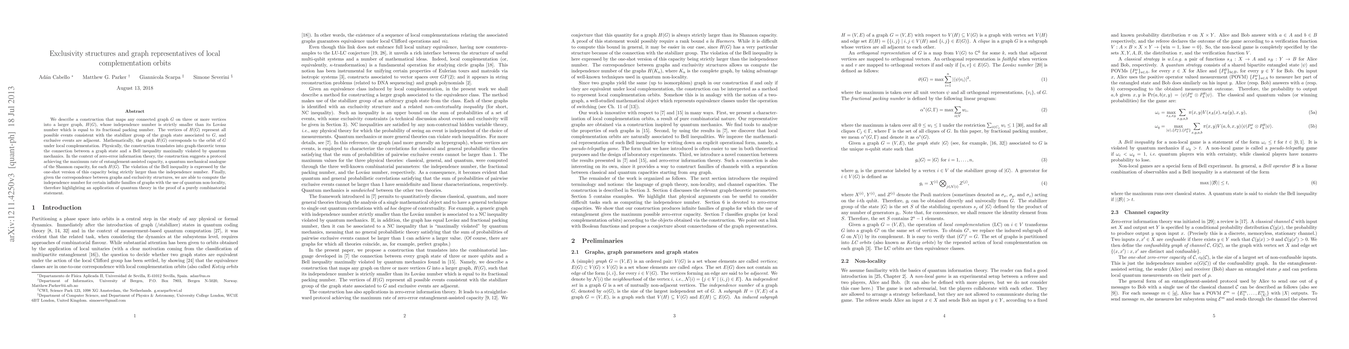 We describe a construction that maps any connected graph G on three or more vertices into a larger graph, H(G), whose independence number is strictly smaller than its Lov\'asz number which is equal to its fractional packing number. The vertices of H(G) represent all possible events consistent with the stabilizer group of the graph state associated with G, and exclusive events are adjacent. Mathematically, the graph H(G) corresponds to the orbit of G under local complementation. Physically, the construction translates into graph-theoretic terms the connection between a graph state and a Bell inequality maximally violated by quantum mechanics. In the context of zero-error information theory, the construction suggests a protocol achieving the maximum rate of entanglement-assisted capacity, a quantum mechanical analogue of the Shannon capacity, for each H(G). The violation of the Bell inequality is expressed by the one-shot version of this capacity being strictly larger than the independence number. Finally, given the correspondence between graphs and exclusivity structures, we are able to compute the independence number for certain infinite families of graphs with the use of quantum non-locality, therefore highlighting an application of quantum theory in the proof of a purely combinatorial statement.