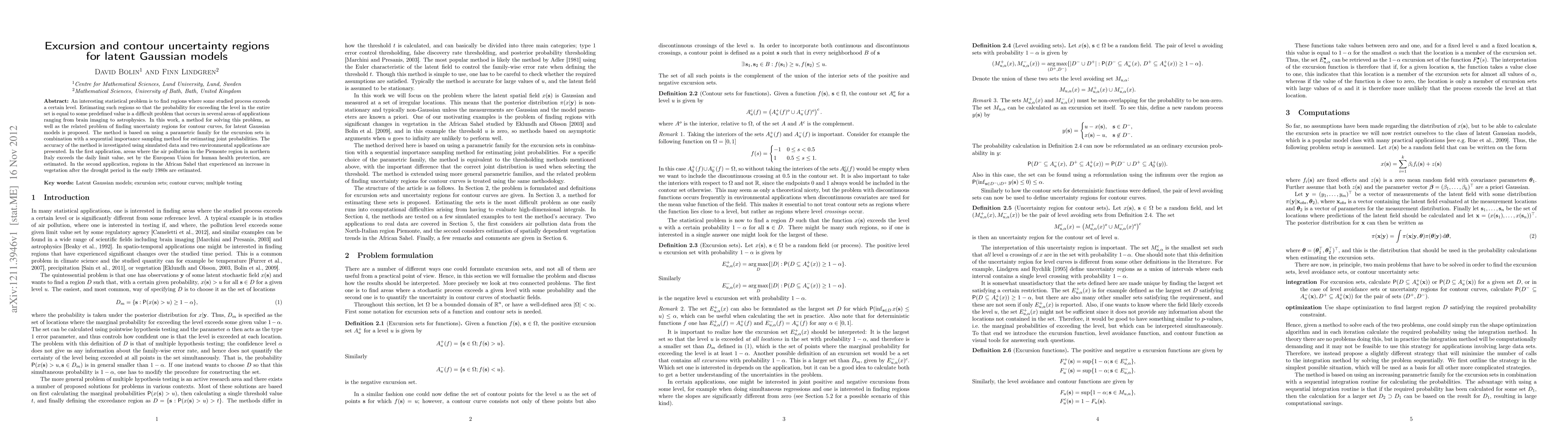 An interesting statistical problem is to find regions where some studied process exceeds a certain level. Estimating such regions so that the probability for exceeding the level in the entire set is equal to some predefined value is a difficult problem that occurs in several areas of applications ranging from brain imaging to astrophysics. In this work, a method for solving this problem, as well as the related problem of finding uncertainty regions for contour curves, for latent Gaussian models is proposed. The method is based on using a parametric family for the excursion sets in combination with a sequential importance sampling method for estimating joint probabilities. The accuracy of the method is investigated using simulated data and two environmental applications are presented. In the first application, areas where the air pollution in the Piemonte region in northern Italy exceeds the daily limit value, set by the European Union for human health protection, are estimated. In the second application, regions in the African Sahel that experienced an increase in vegetation after the drought period in the early 1980s are estimated.